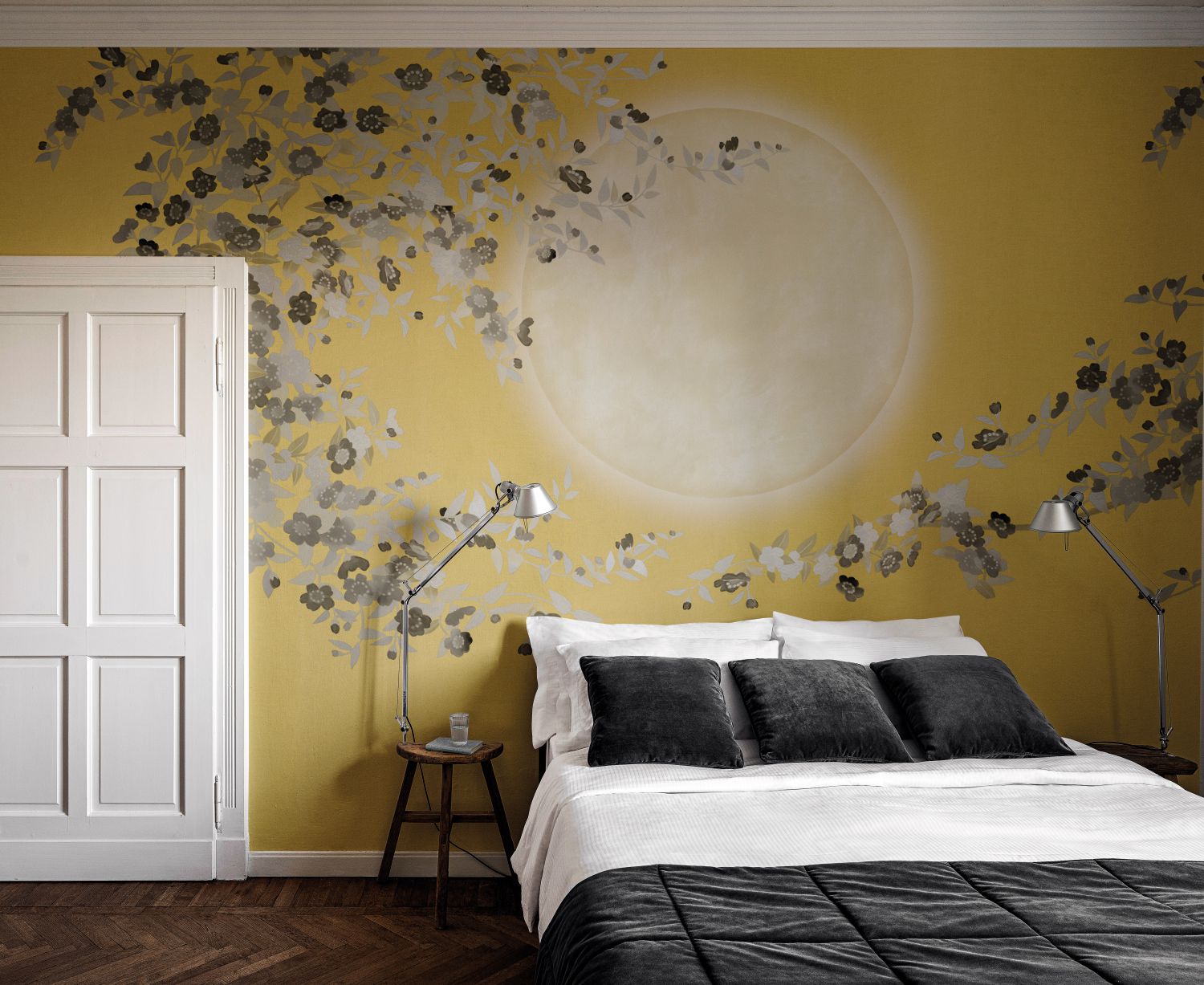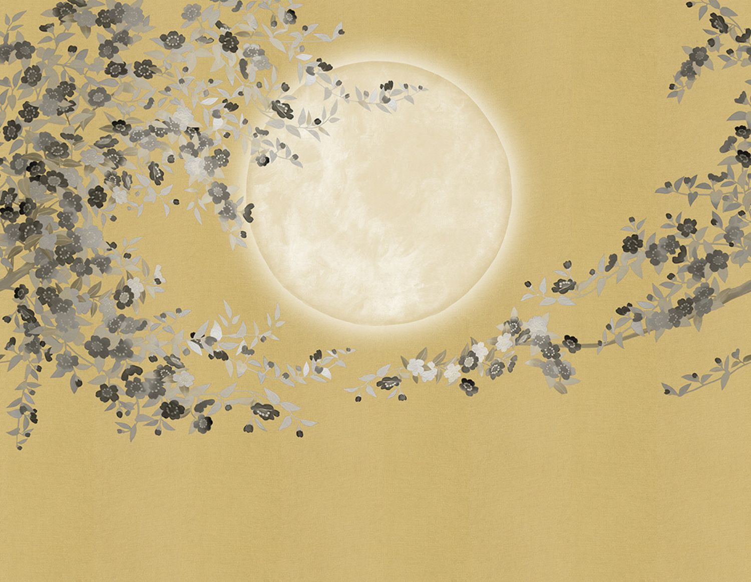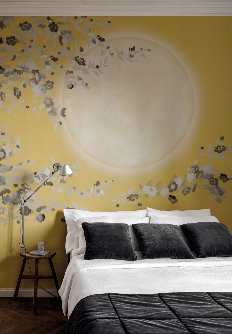 Ein großer Mond, umgeben von einem Wirbel aus Blumen, die wie von einem leichten Zephyr geführt zu tanzen scheinen. Eine Dekoration, die jedem Raum Zentralität und Harmonie verleiht.