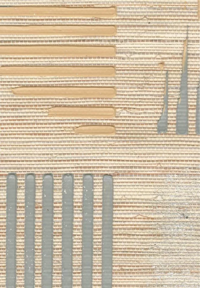 Horizontale und vertikale Linien, die in hellen Quadraten angeordnet sind, werden auf einer Gesso-Basis mit Gold, Silber und Kupfer hervorgehoben.