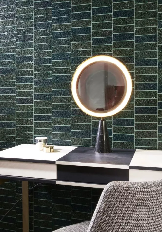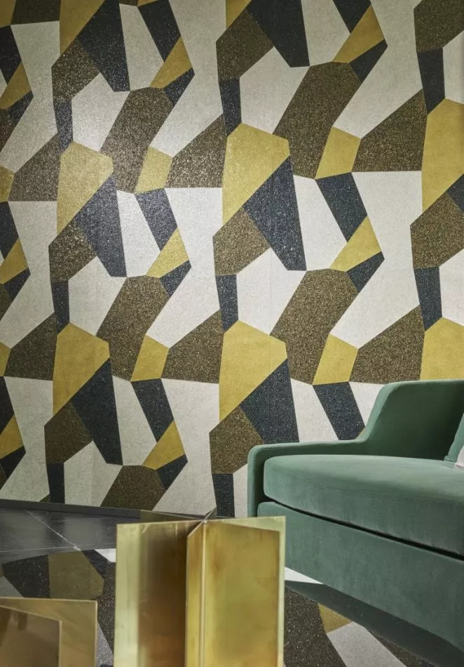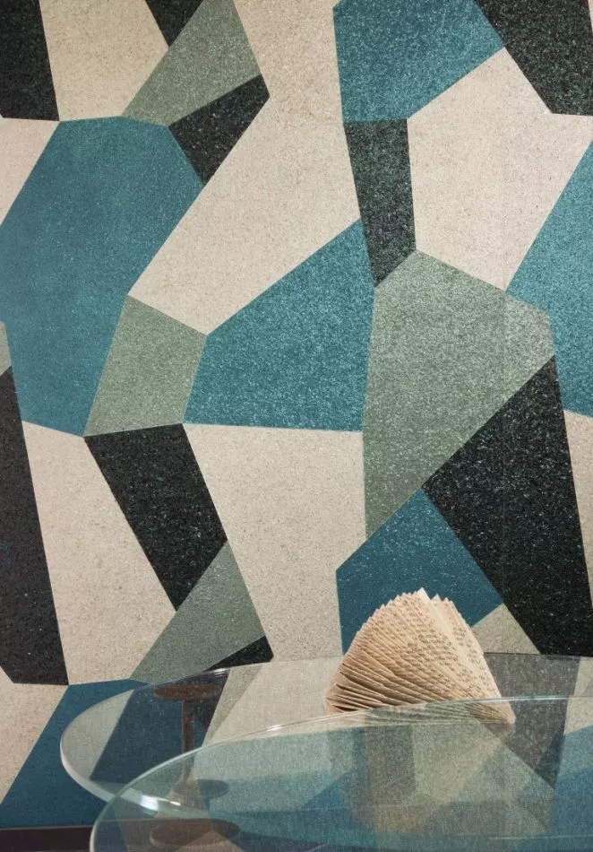 Made of real mica flakes*. The sheets with the mica flakes are hand-dyed, after which large, irregular shapes are punched through them. These are carefully inlaid into a repetitive pattern. The pattern is a modern interpretation of the colourful, classic terrazzo floors.