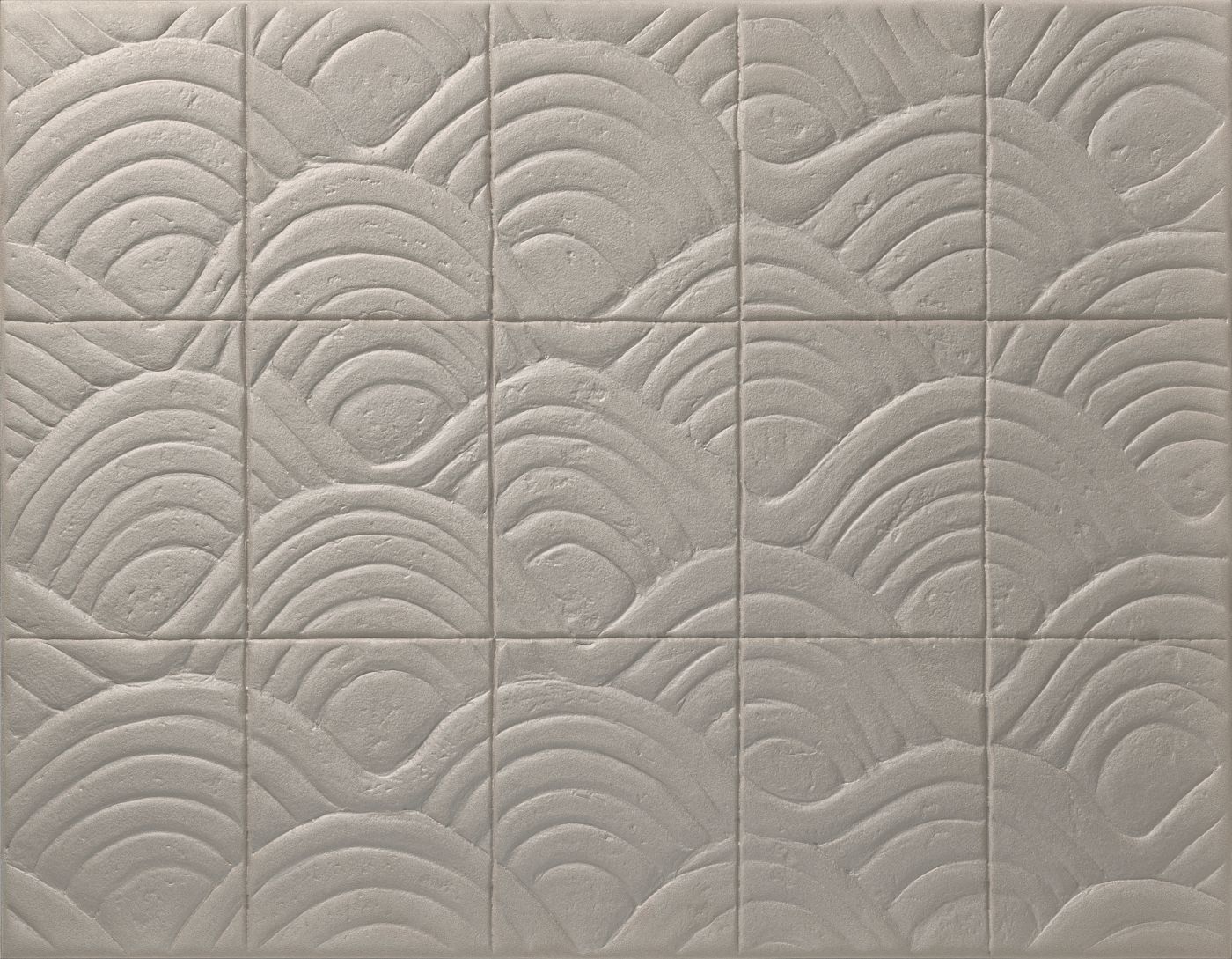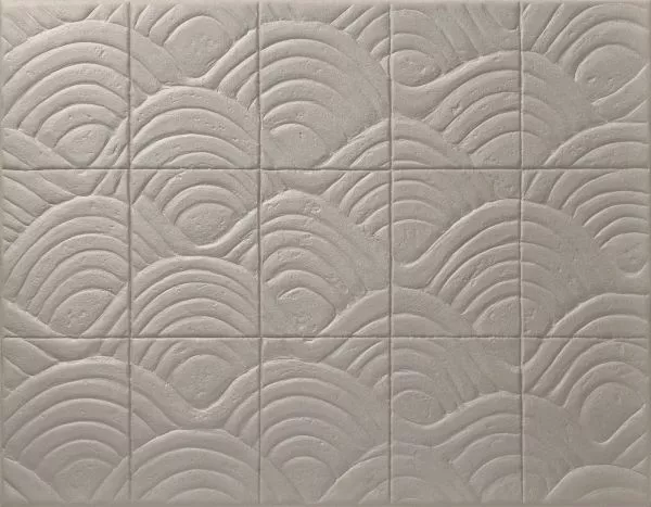 Thanks to the pronounced relief of the engravings, it is reminiscent of decorative earthenware or ripples in sand.