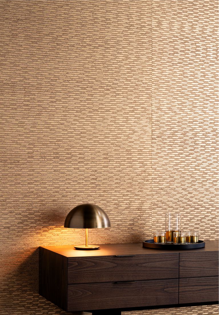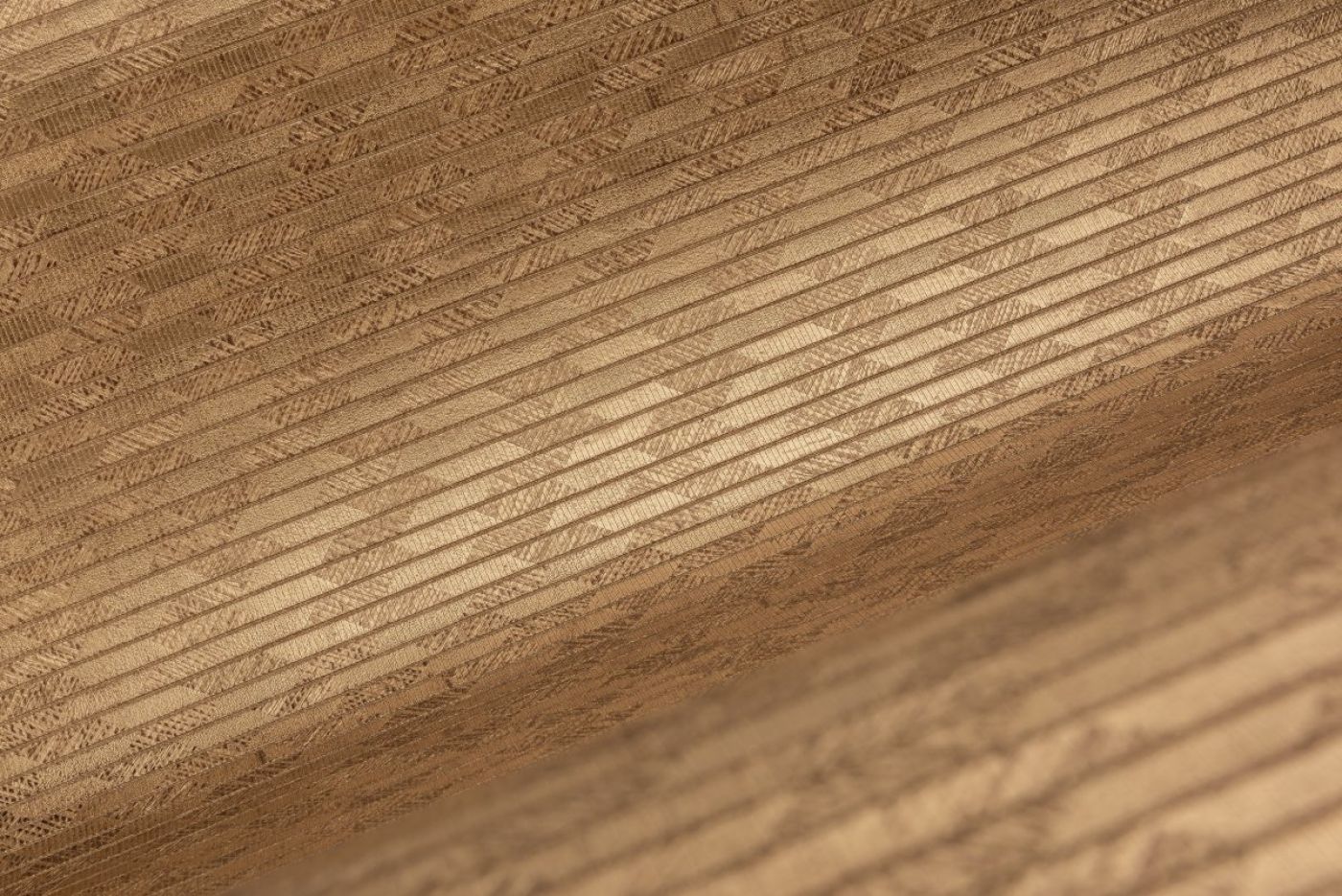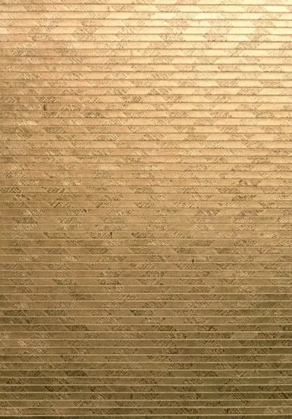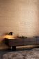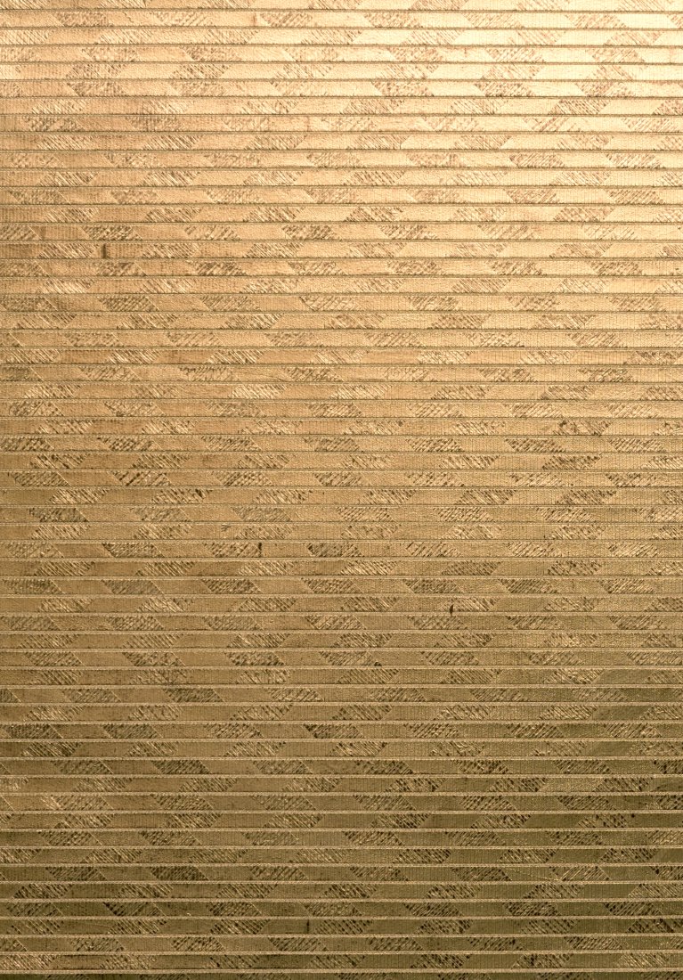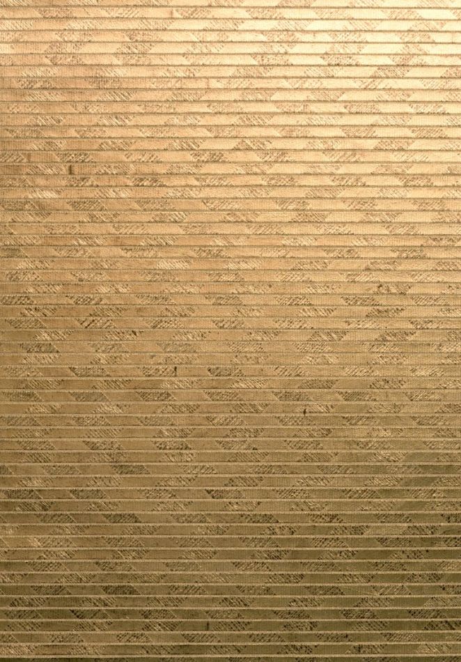A traditionally-made wallcovering with hand-folded paper as an eyecatcher. The paper is patinated with metallic ink and cut into small strips. These strips are woven with a hand loom. So there is no repeated pattern, making every piece genuinely unique.
