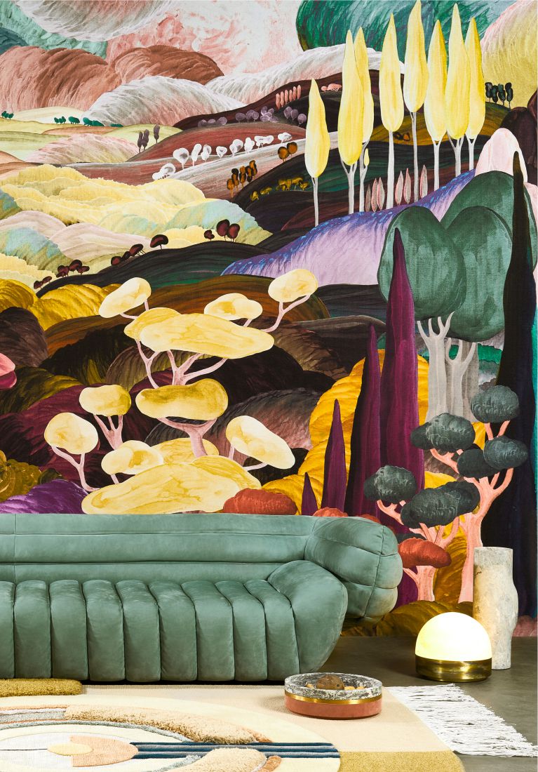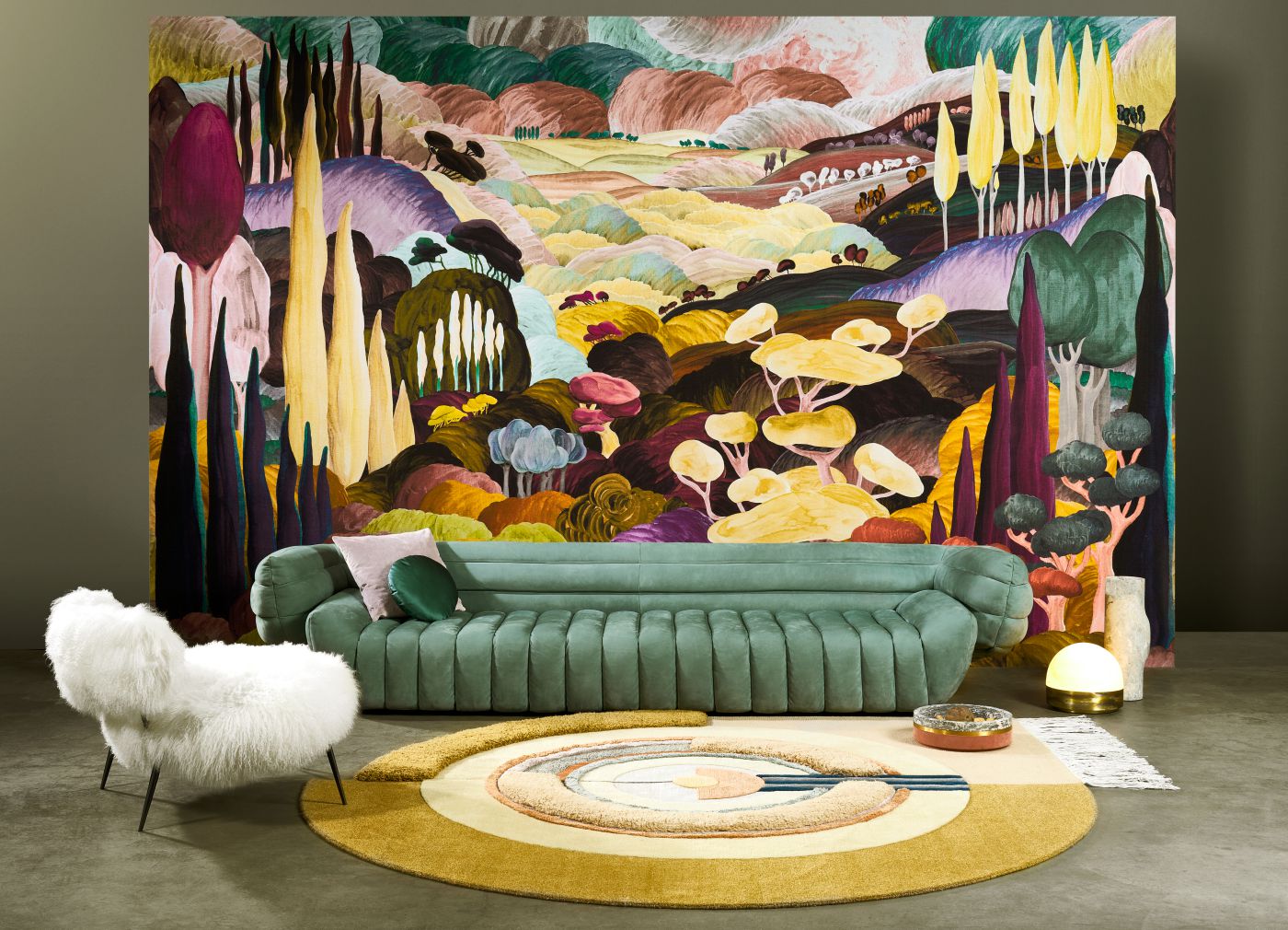 Songes depicts a Tuscan landscape in a dreamy fantasy world. This panorama in chenille finish appeals to the imagination thanks to its soft shapes. The cypresses, a typical symbol of Italian nature, provide a lifting, vertical effect.