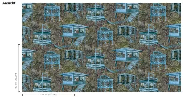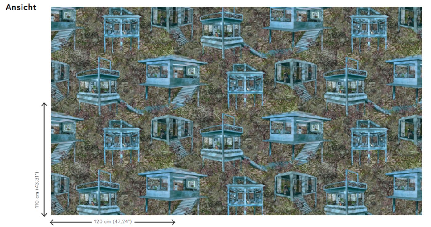 Inspired by French “toile de jouy”: romantic, floral and lovely scenes in red or blue on white backgrounds. Palafitas interprets this style of textile printing in a completely innovative way and takes you to mysterious stilt houses in the Brazilian rainforest.