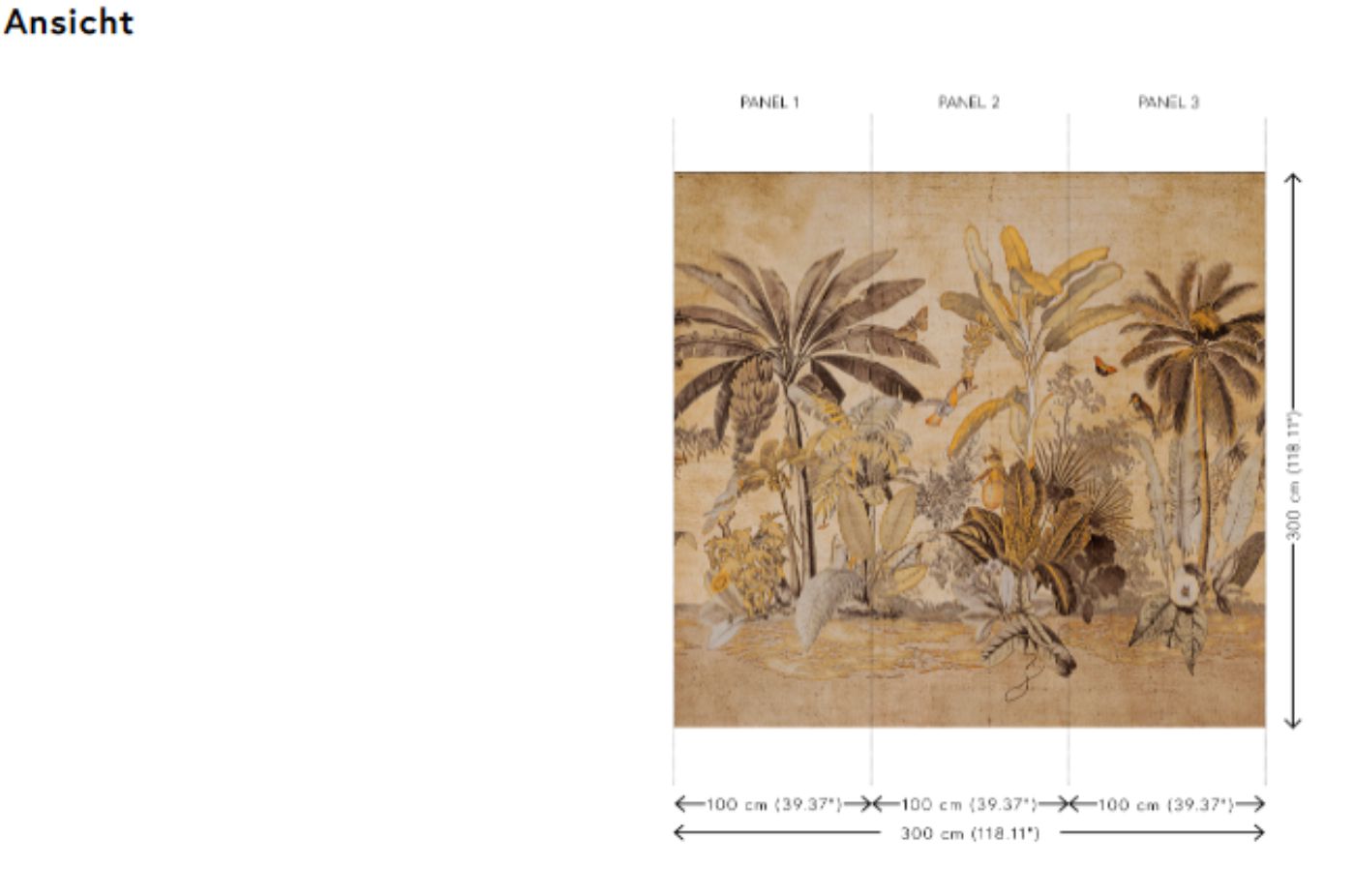 A paradise scene that makes you dream away. Hummingbirds, parrots and monkeys live harmoniously in the land of milk and honey. This panoramic is printed on a background with a parchment paper look for an unmatched vintage effect.