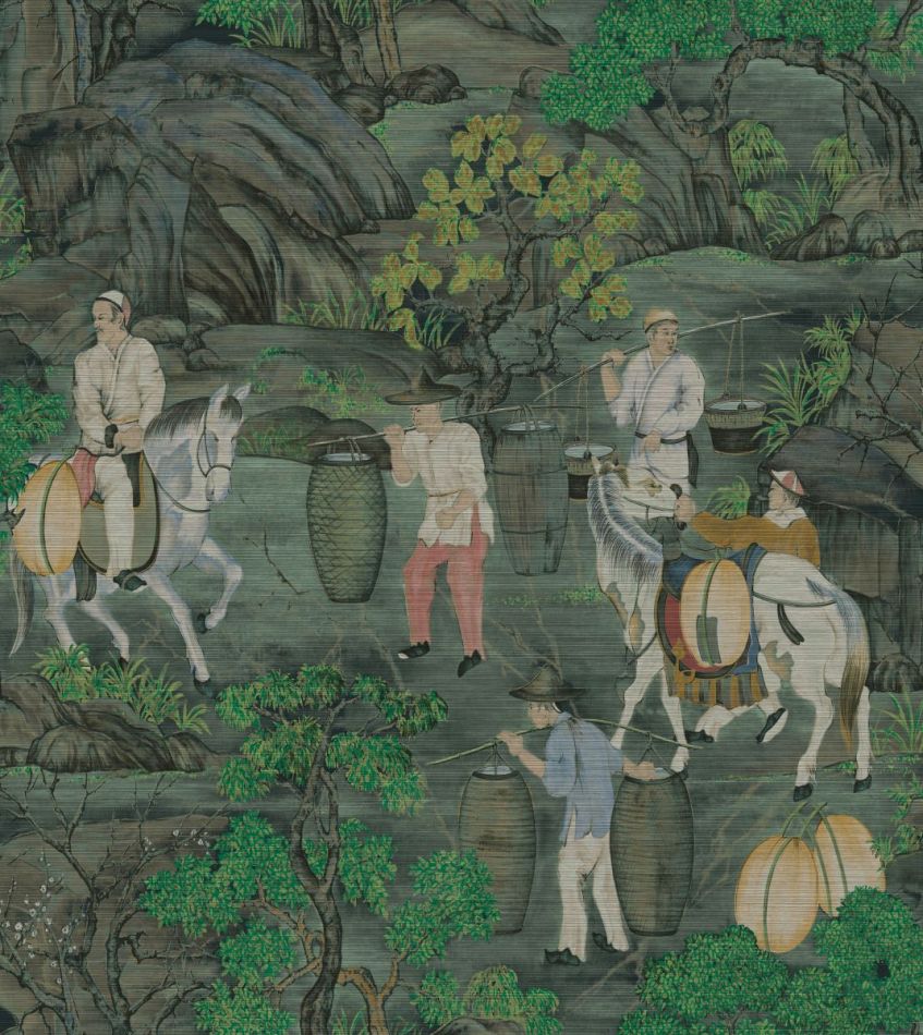 Toile de Tibet features a colourful agricultural scene from Tibet, in which strength and craftsmanship combine to create purity and authenticity. This hand-painted decor is printed on horizontally woven paper look strips, creating a weathered effect.