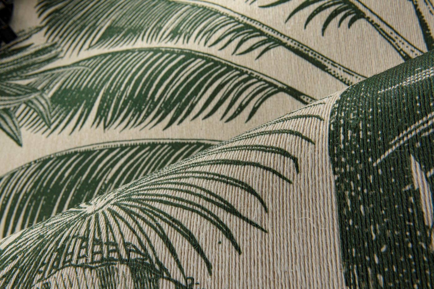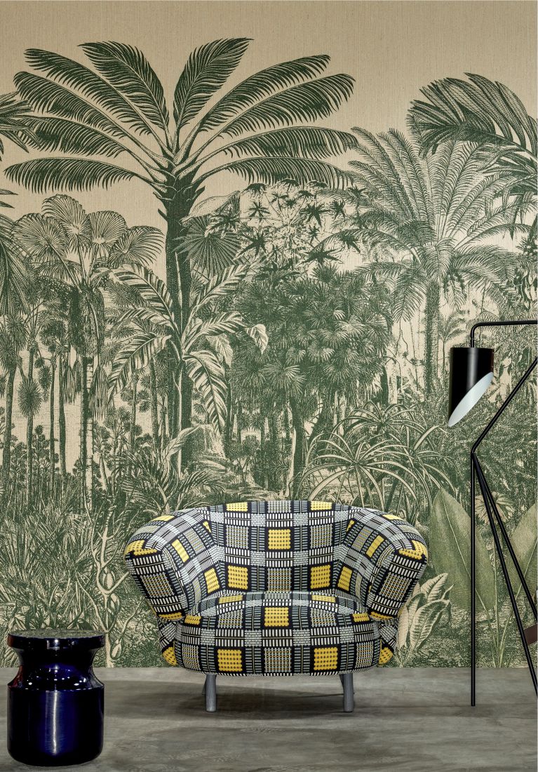 This colonially inspired landscape is based on an etching. The two-tone pattern uses thick jute and a fil-à-fil technique in which the fibres used are clearly visible. The vertical lines ensure a lifting effect on the wall.