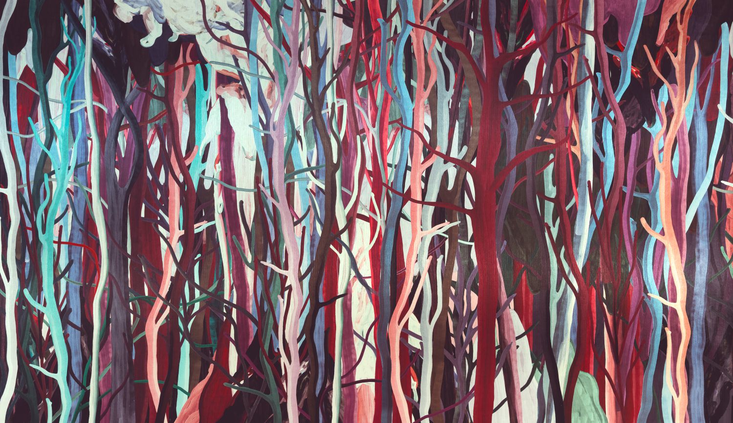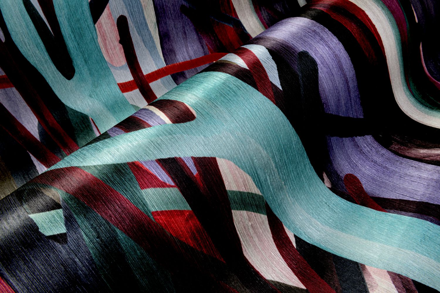 This panorama is a colourful interpretation of an exotic mangrove, with elegantly drawn plant roots creating a graphic vertical effect. Digitally printed on an authentic glossy fil-à-fil textile with a soft velvet touch, this wallcovering exudes luxury.