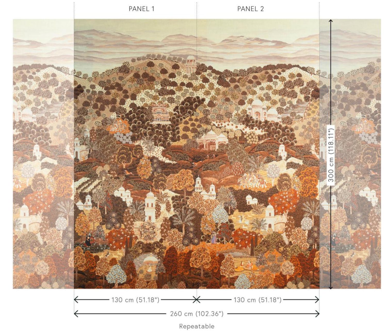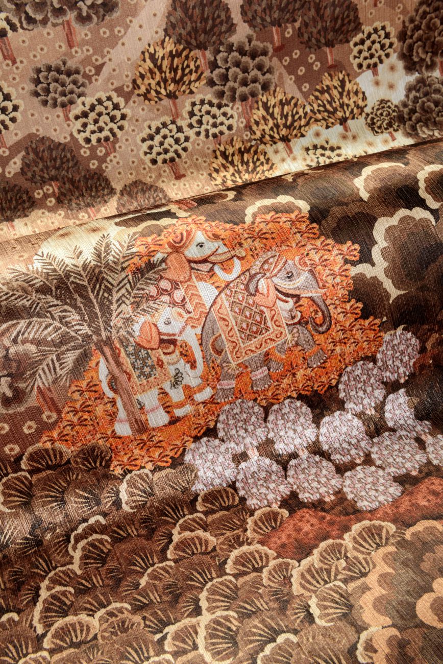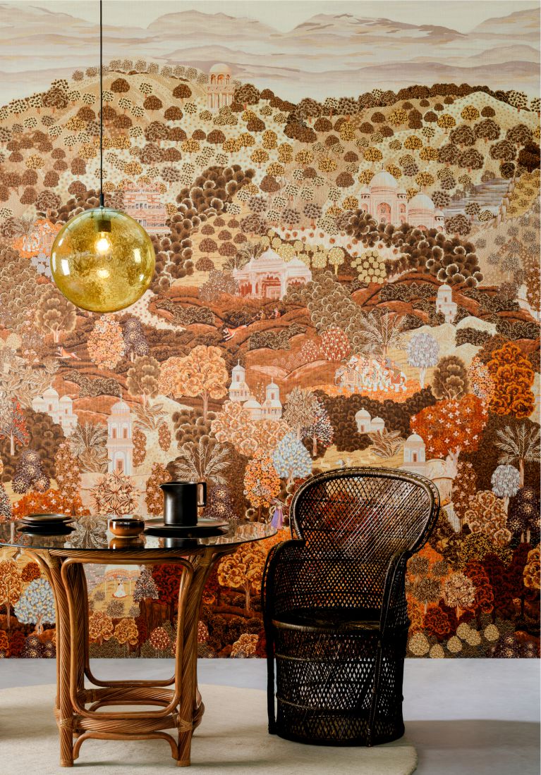 The richly detailed panorama Sundara draws inspiration from the Indian region of Rajasthan, celebrated for its stunning landscapes and colourful palaces. Aptly named Sundara, a Sanskrit word meaning beautiful, noble, and beauty. The luxurious fil-à-fil textile finish and warm colours enhance the lush appearance of this enchanting design.