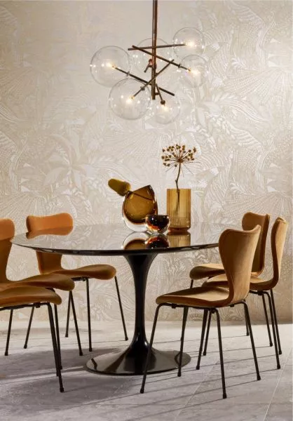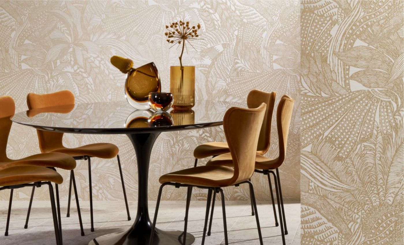 Icons charms with its versatility of materials, all established values in interior decorating, such as shagreen leather (galuchat), bouclé fabric, metal accents and rattan. However, the application of these evergreens on the wall is extremely surprising and original. Typical are the various geometric patterns that show a striking block motif. Not only the warm material mix is a surprising factor, the varying incidence of light and the play of matte and gloss also give an extra luxurious dimension.