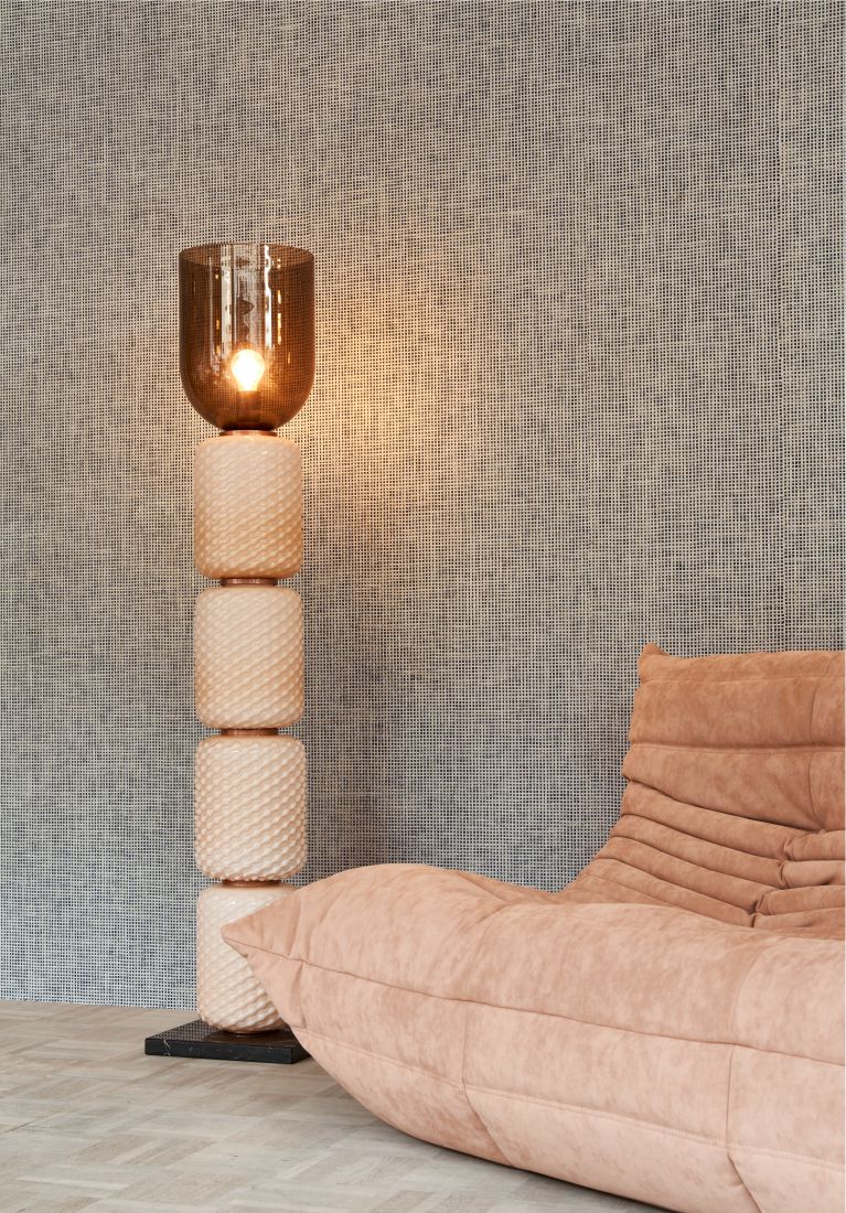 Icons charms with its versatility of materials, all established values in interior decorating, such as shagreen leather (galuchat), bouclé fabric, metal accents and rattan. However, the application of these evergreens on the wall is extremely surprising and original. Typical are the various geometric patterns that show a striking block motif. Not only the warm material mix is a surprising factor, the varying incidence of light and the play of matte and gloss also give an extra luxurious dimension.