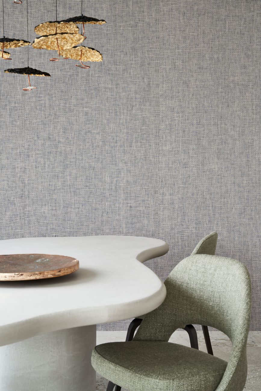 The technique used, weaves together strips of paper. This forms a waffled effect that is reminiscent of waffle linen fabric. This creates structure on the wall in a subtle and refined way.