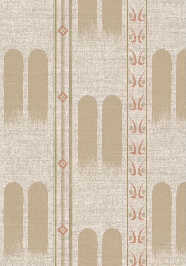 This airy design is named after the Indian city of Pune, formerly Poona, home to the magnificent Aga Khan Palace. Poona draws inspiration from the palace’s graceful arches and is printed on a vinyl base with a realistic, evenly woven linen texture.