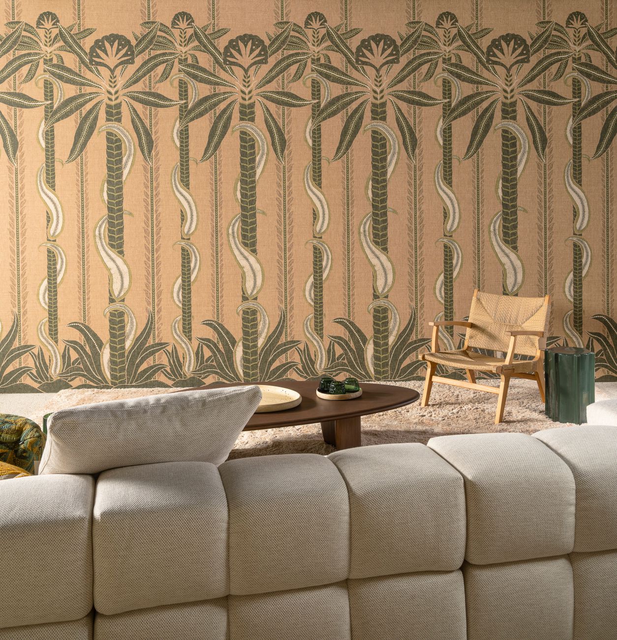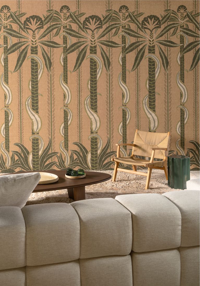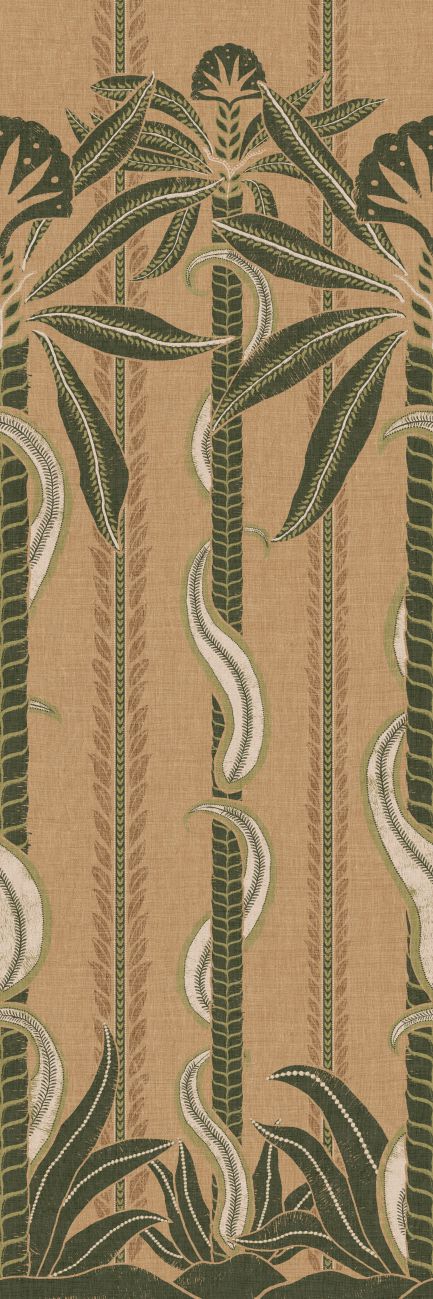 The swaying palms along the riverbanks of the Indian state of Kerala inspired this panoramic design. Its graceful lines stand out beautifully on the vinyl base, which has the relaxed, open-woven texture of linen.