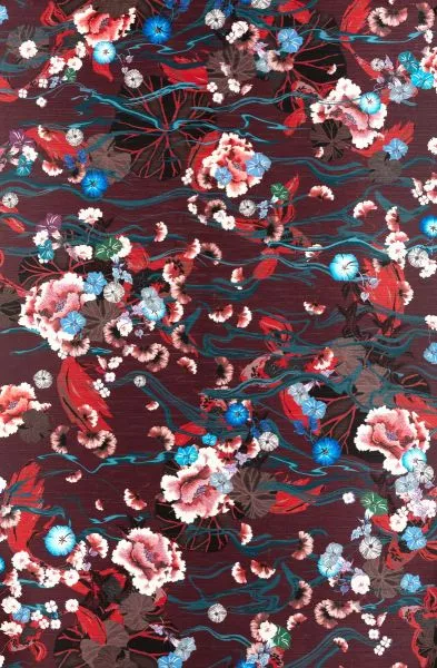 This scene of a Japanese pond viewed from above reflects the lush natural beauty of water. Be surprised by the depth in the design and discover life above and under the water. The textile with a silk look represents elegance and refinement.