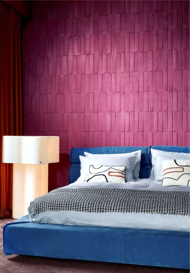 The pronounced texture of the wallcoverings adds a tactile dimension to the room, while the soft velvet fabric lends it a sense of warmth and cosiness.