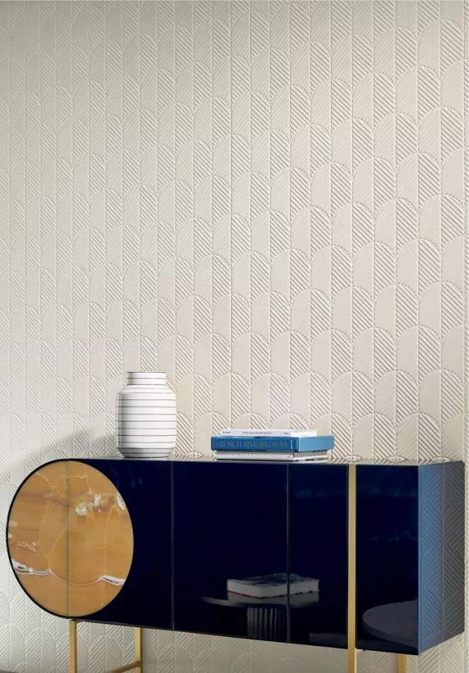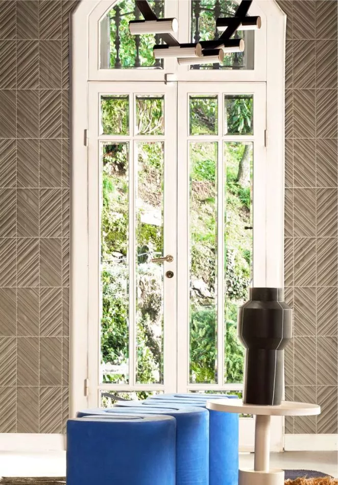 “Iki”, a concept that is difficult to translate into a single word, embraces a world of sophistication, elegance, simplicity and a deep appreciation for the beauty in everyday things. “Iki” becomes tangible in this design, with diagonal lines creating a beautifully magnified herringbone pattern. The distance between these lines is expressively uneven, giving a playful and dynamic feeling to the wall. The pronounced texture lends it a captivating 3D effect, while the top layer in soft velvet adds a touch of luxury, making it almost impossible not to want to touch the wall.