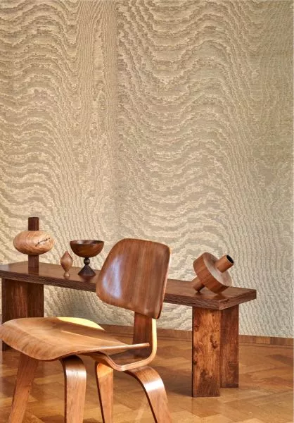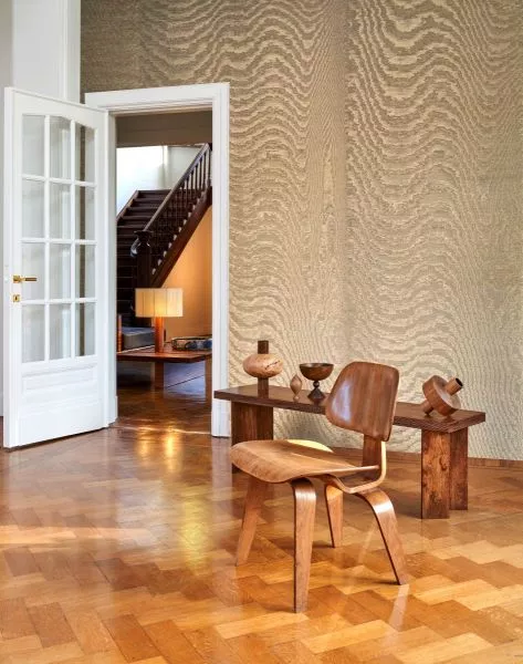 Blinding rays of sun on water and desert sand result in wavy, hypnotic designs and create a moiré effect on the glossy fabric. The motifs are completely random, making each wallcovering unique.