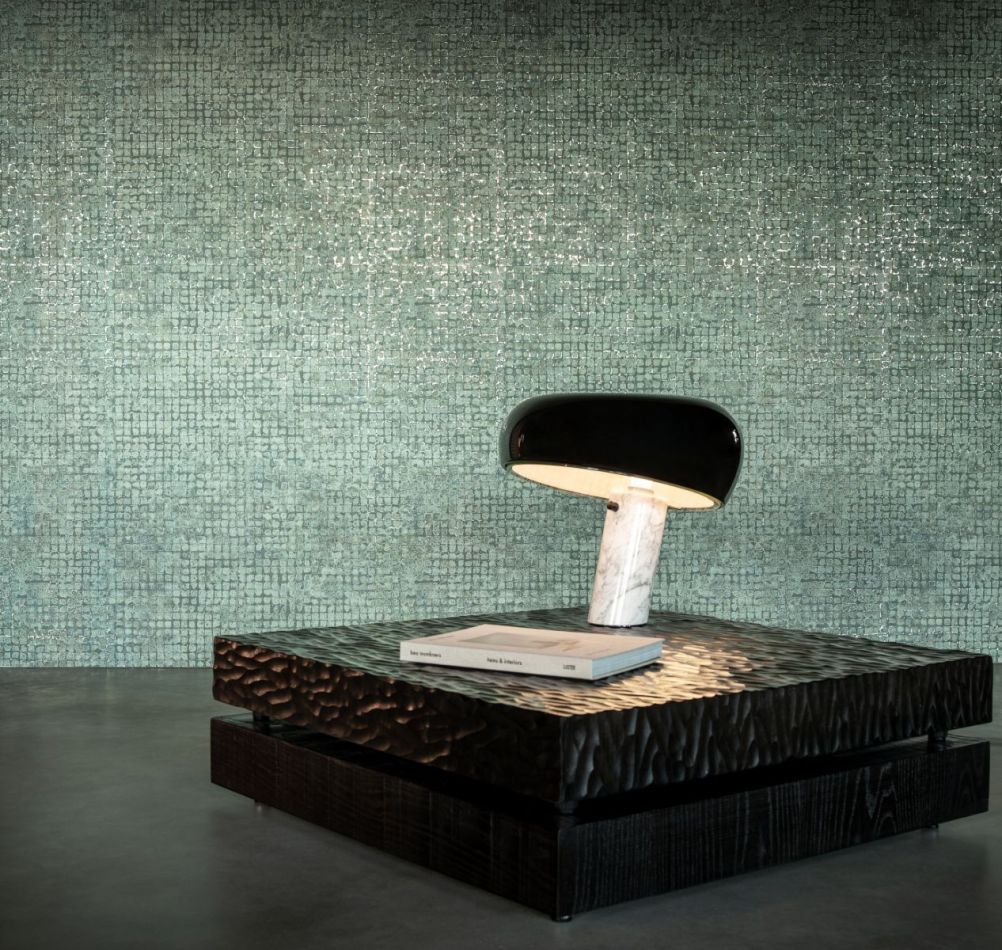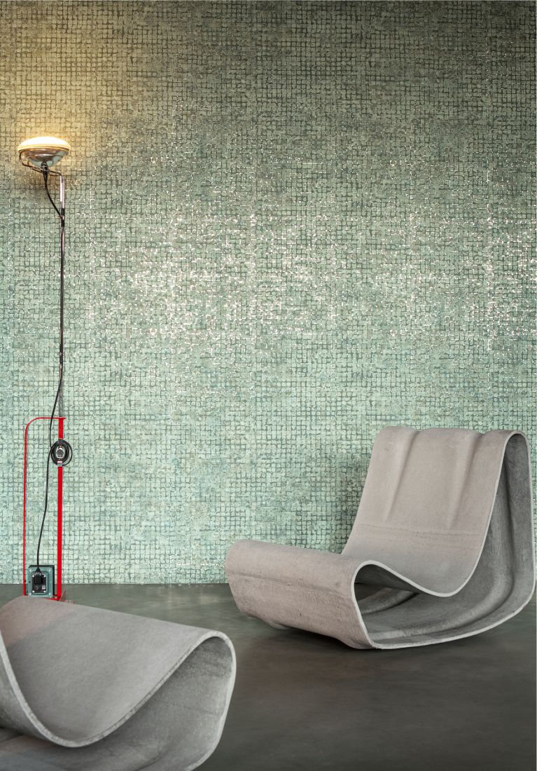 This pattern consists, as it were, of woven mica. First, sheets are coloured with glued mica flakes. They are cut into very narrow strips, which are then woven with a conventional loom. The result is a wallcovering with the look of a very fine, gently glistening mosaic.