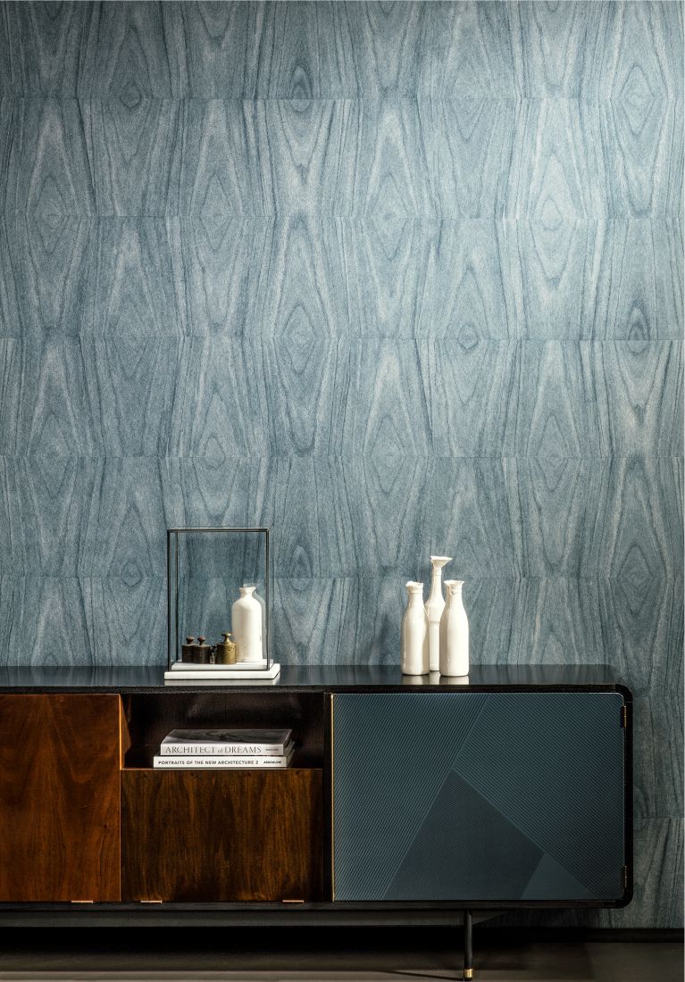 Axedo design reflects a natural, calming atmosphere and brings a warm atmosphere into your home with its gentle colour and woodgrain structure. The geometric touch gives a playful effect. Axedo comes in six colours, including blue-grey: a colour which will ornament many interiors in the forthcoming season.
