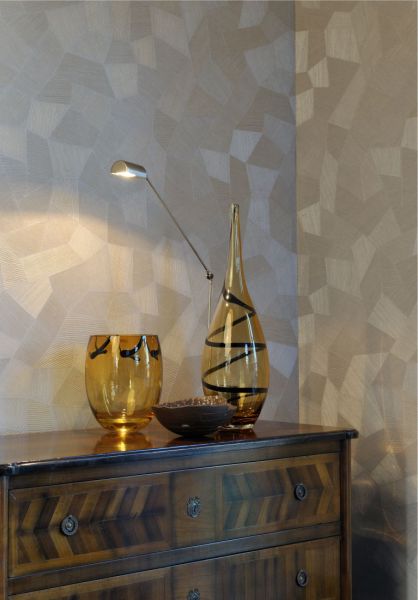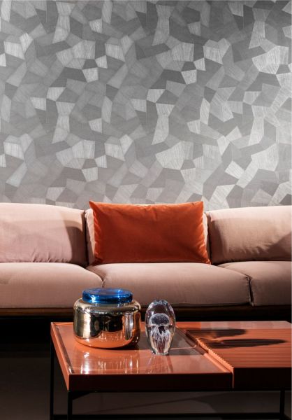 A surprising pattern with irregular polygons which gives the illusion of relief and fits in perfectly with any interior. The lustrous finish challenges the light, absorbing or reflecting it.