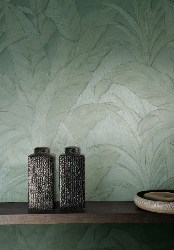The leaves of the banana plant depict the tropics. This print stands out figuratively in its naturalness and literally in the luxurious finish in metallic lustre.
