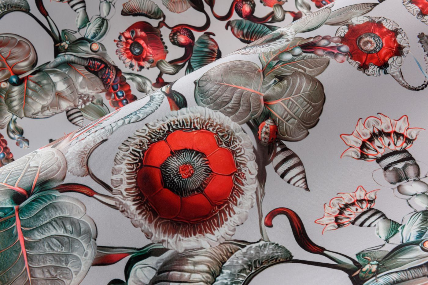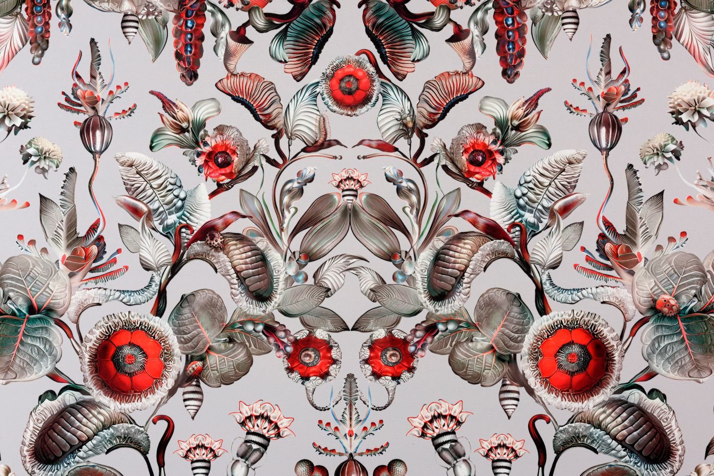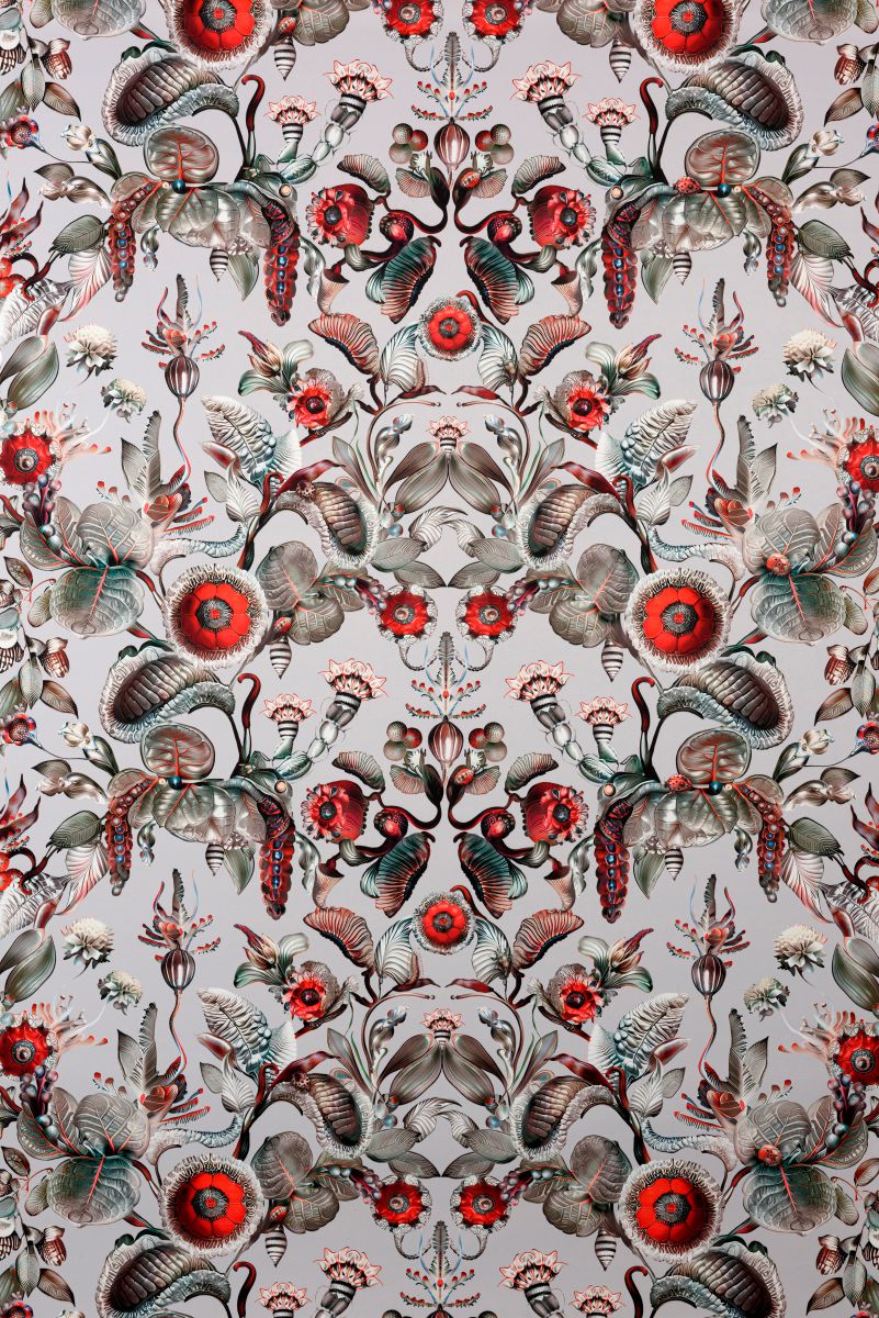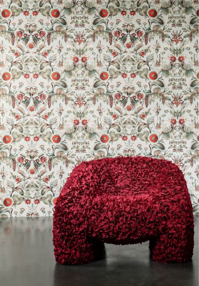 The Coccinella Bella Wallcovering is inspired by the wide range of flowers and leaves that Coccinella Bellas call home, the motif features a Jacobean-like floral pattern printed on a soft touch textile.