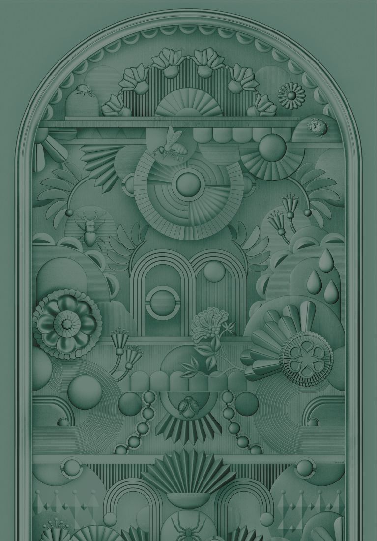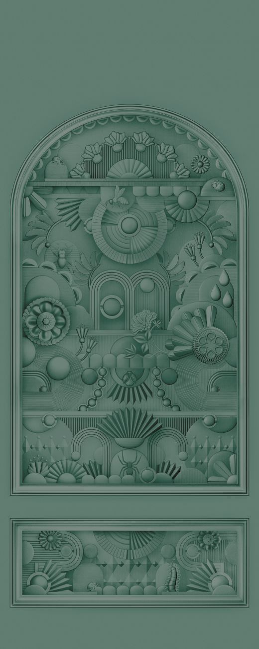 The Greenhouse Gathering wallcovering is a stunning wallcovering that draws inspiration from decorative moulding. The design imitates the sensation of peering through the glass panels of a Green House, uncovering the mesmerising marvels of lush flowers. When examined more closely, intricate features become apparent, highlighting the hidden small creatures moving through a lush green landscape. Infused with the charm of art deco, the Greenhouse Gathering wallcovering comes in a monochrome palette that reminds of plasterwork. The wallcovering has a soft suede look for added tactility.