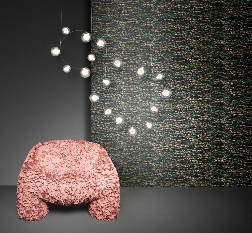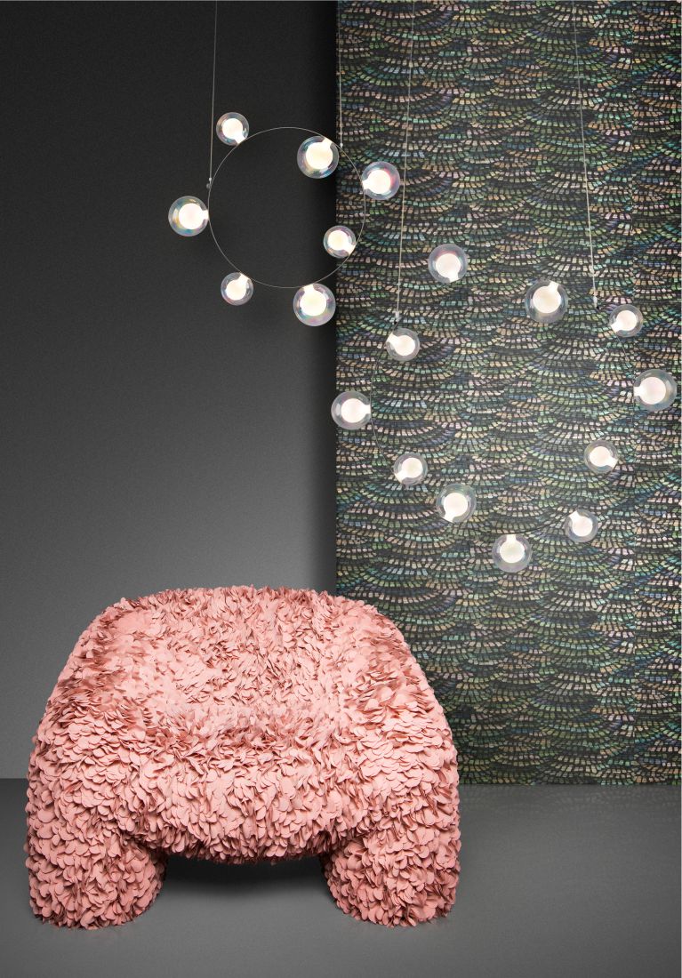 The Dandelion Cranes Wallcovering is made from pleated textile, inspired by the Cranes’ unique colouring and fanlike wings. The tactile design comprises overlapping textile pleats placed in a pattern that resembles feathered fans.