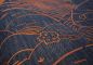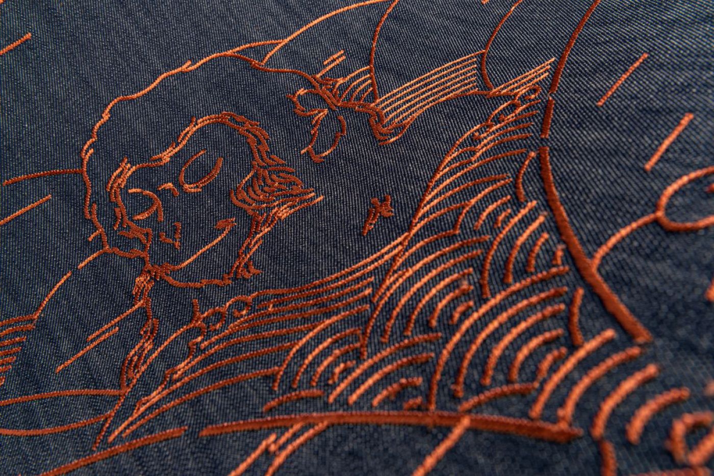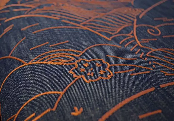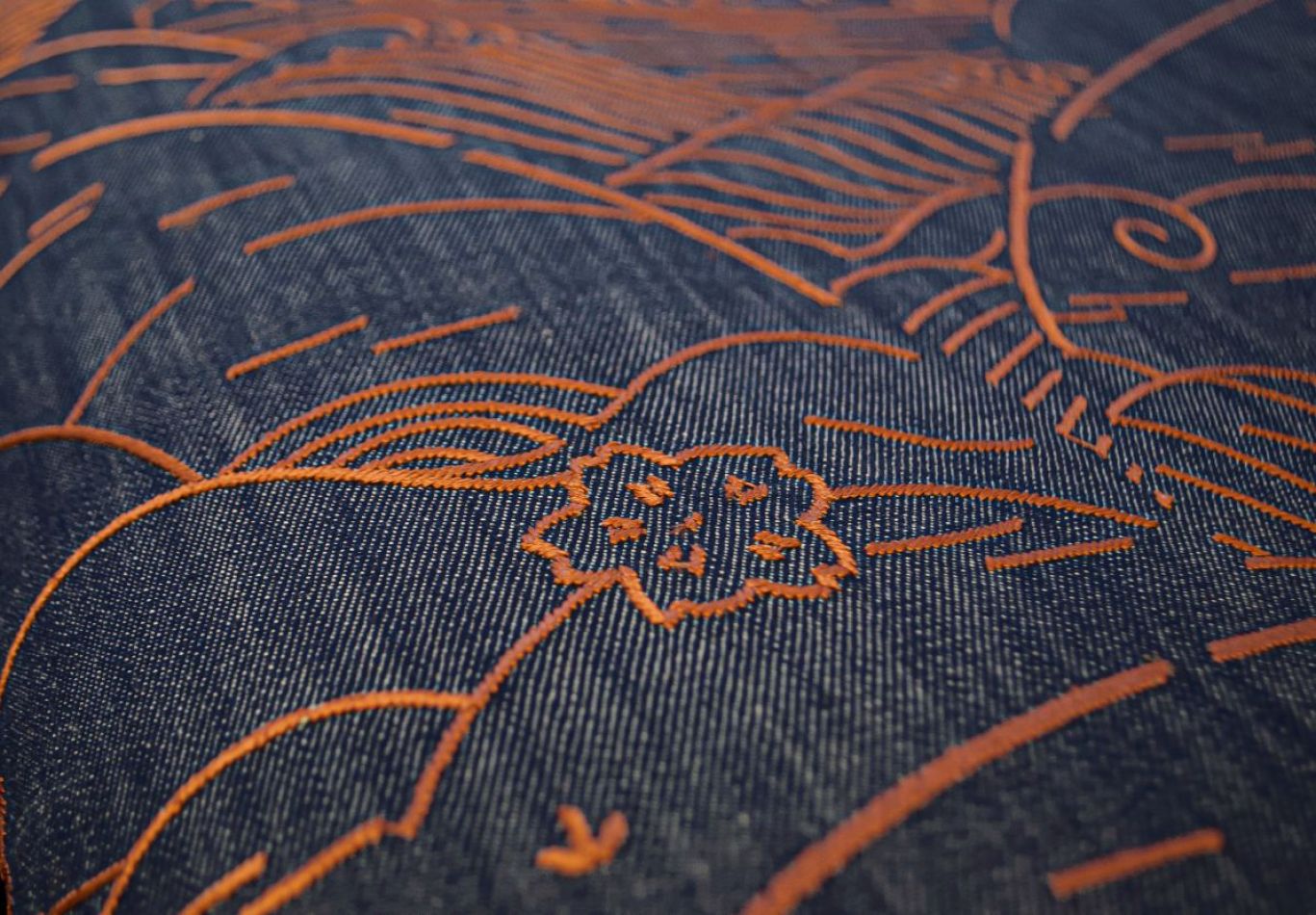 Description: Denim wallcovering with coloured embroidery. The design displays a playful scene of Indigo Macaque families