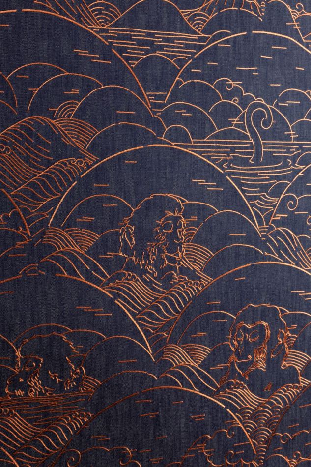 Textile wallcovering made from denim, with coloured embroidery. The design on the Indigo Macaque wallcovering displays a playful scene of Indigo Macaque families bathing in their favourite relaxing spot: the hot springs at the foot of the Japanese mountains.