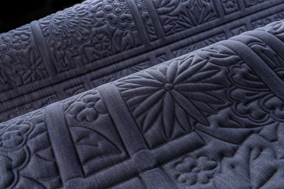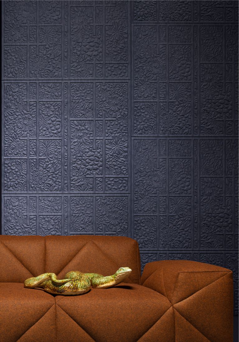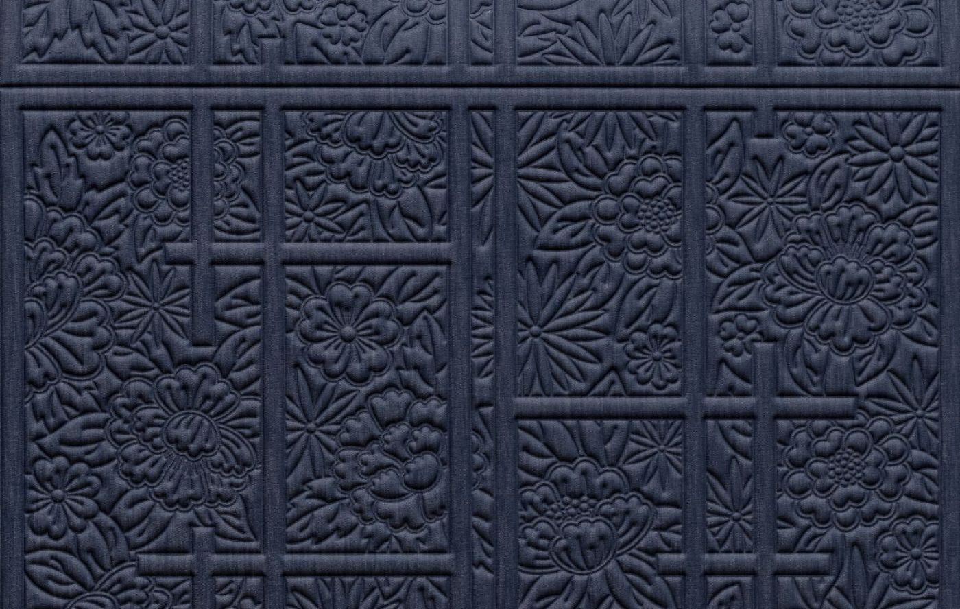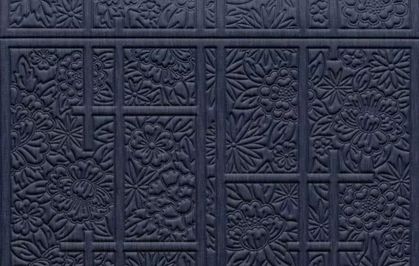 Description: 3D wallcovering made from denim and felted wool. Symbolic cherry blossoms and straight lines resembling the minimalistic feel of Japanese Shoji screens