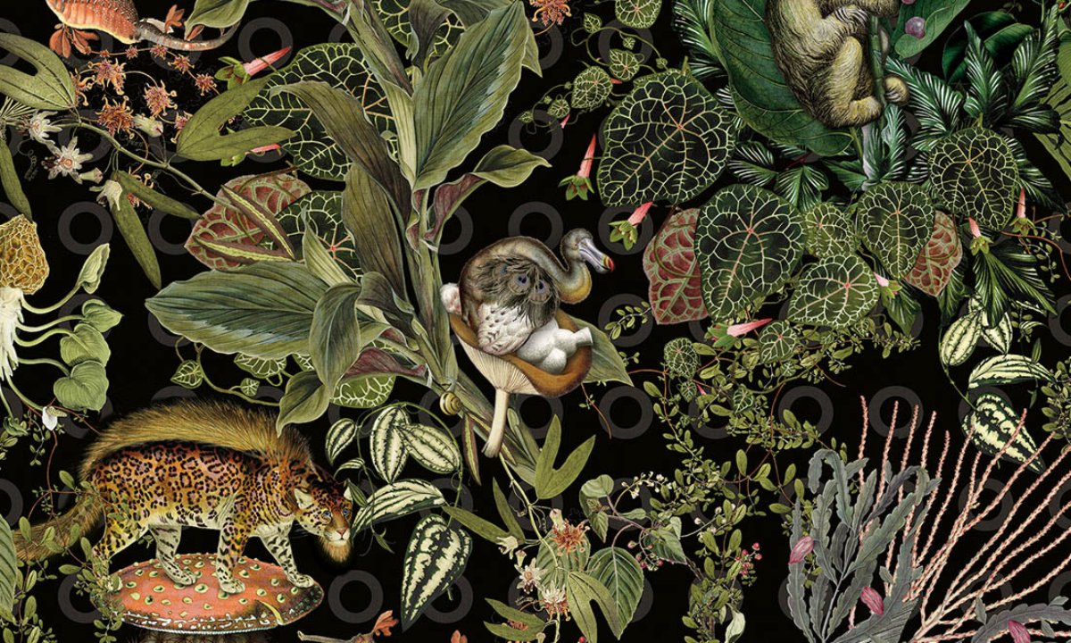 A fantastic fauna print – digitally printed on soft touch textile with a non-woven backing – in which each of the 10 extinct animals are mysteriously hidden.