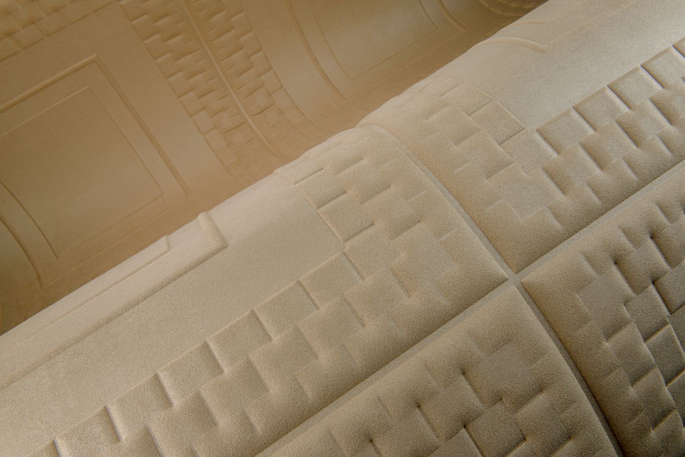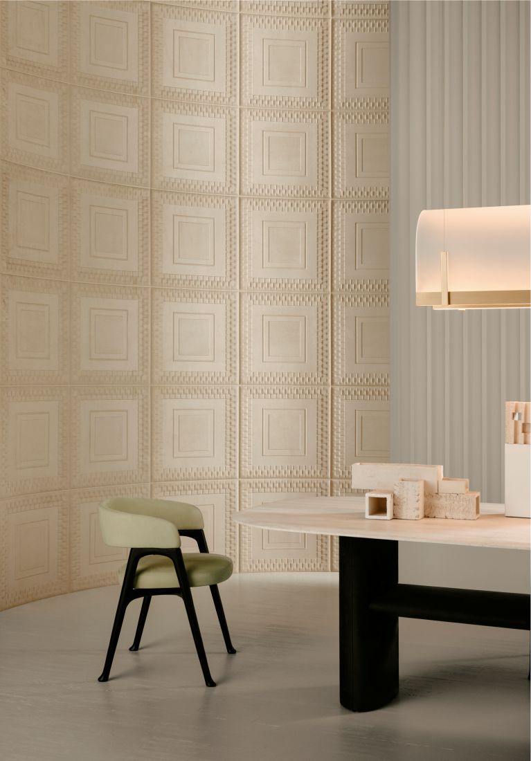 This design is inspired by the coffered ceiling of the Pantheon. The Romans used this construction to lighten the vaulted structures of domes and ceilings. In addition to colour and texture, Pantheon also adds relief to the wall. It is finished in a soft suede look for an extra tactile result. This 3D wallcovering also has a positive impact on the acoustics in a room.