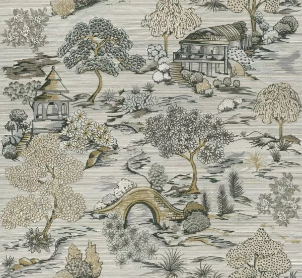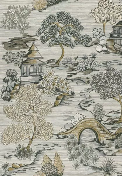 Description: Fairy-tale scene of a Japanese garden embroidered on a sisal background