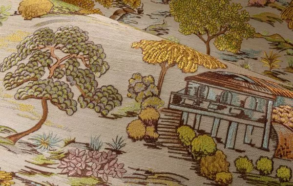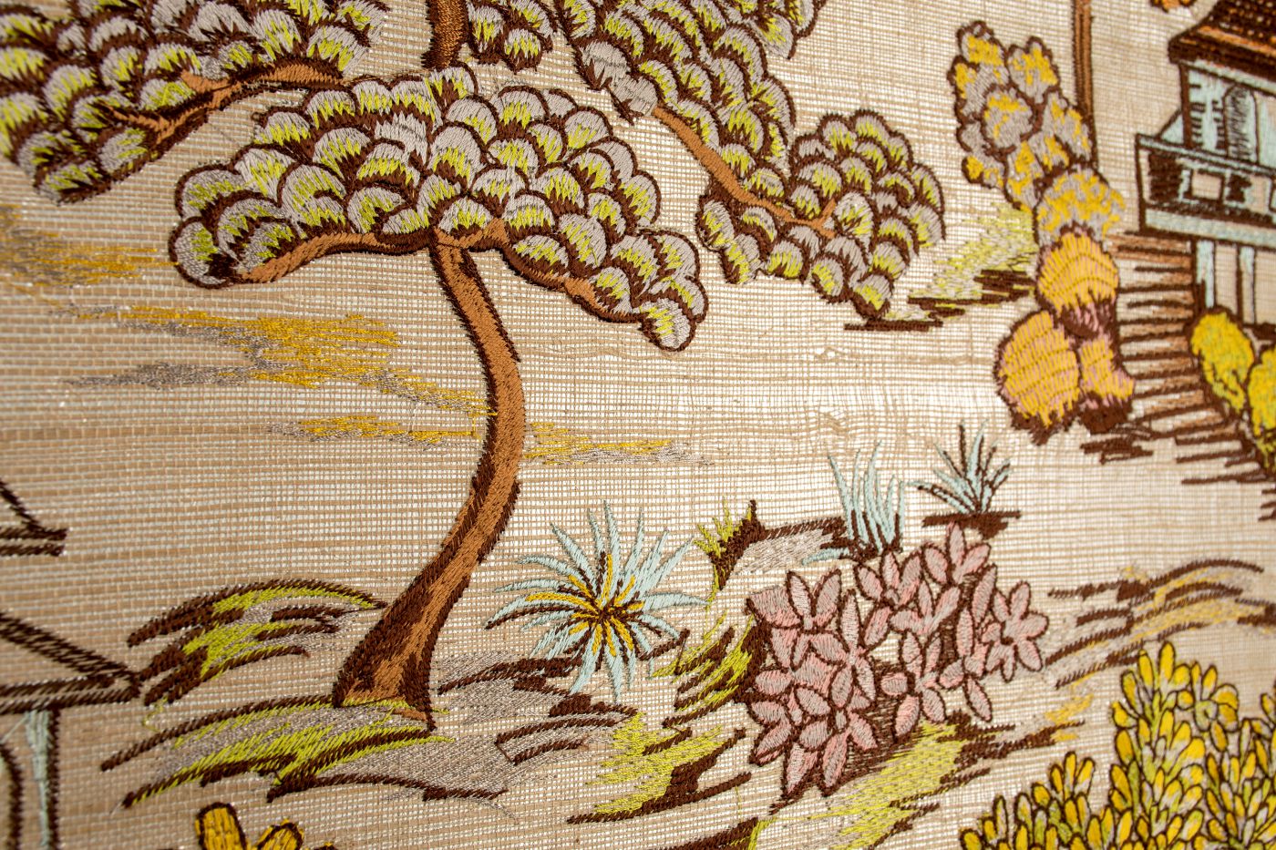 Description: Fairy-tale scene of a Japanese garden embroidered on a sisal background