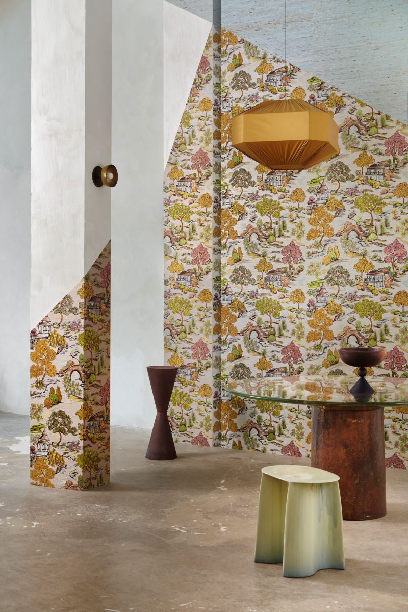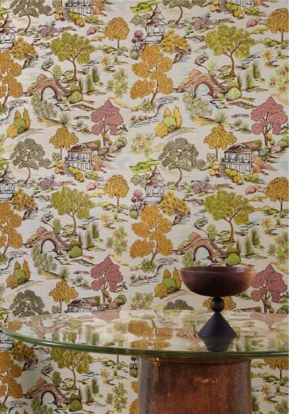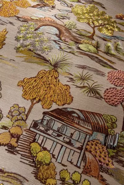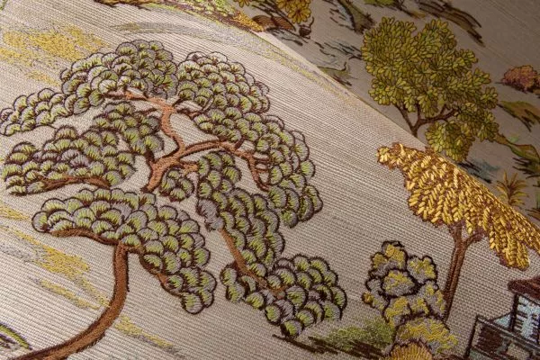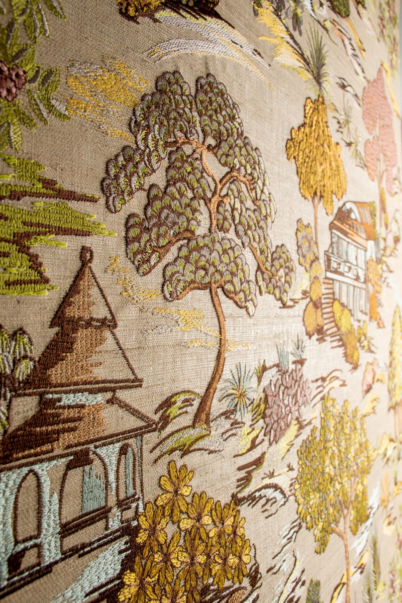 This colourful Japanese garden has been carefully embroidered with great attention to detail onto this base of sisal fibres, with the different shades of the threads revealing its natural character. The fairy-tale scene appeals to the imagination.