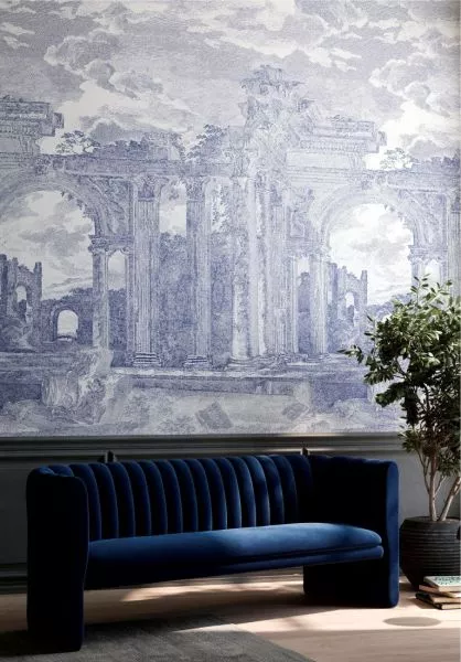Rovine is a stately panoramic in vinyl that imitates an etching of a Greek ruin. The drawing shows antiquity in decay. The work is dedicated to Monsieur Descamps, one of the king’s artists.