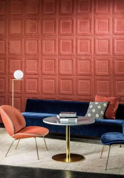 In the warm, charming design of Caisson you clearly recognise a typical antique panel door. The style reminds one of old British libraries. An ideal pattern to be developed in 3D relief. Caisson already existed in the Intrigue collection, but it was given new colour variations in the Spectra collection. The textile used is also different: whereas with Intrigue the design has a smooth, silky feeling, with Spectra it is given the smooth and soft look of suède.