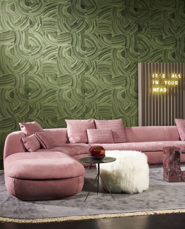 To obtain a nice and lively effect on the wall, a soft-touch velvet with clear nuances was carefully selected. Light markings, characteristic to velvet, may occur or appear in the deeper parts of the patterns, contributing to the natural charm of the product.