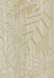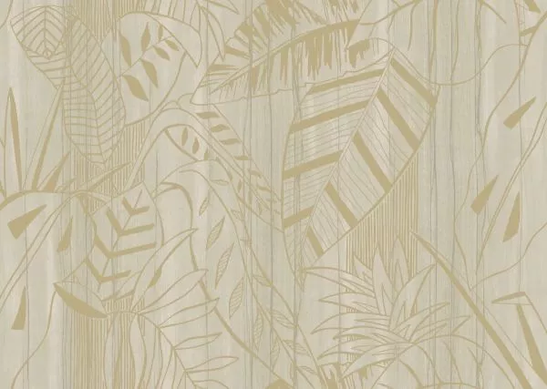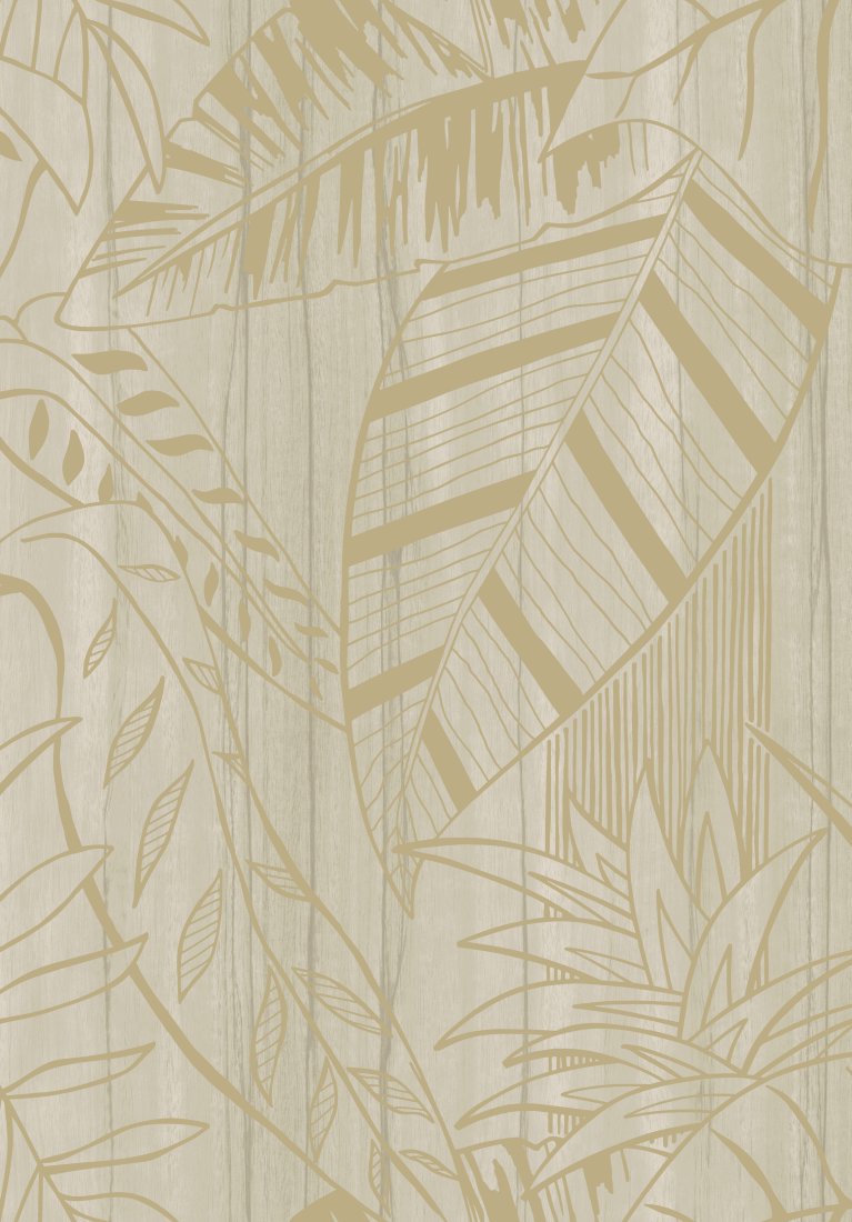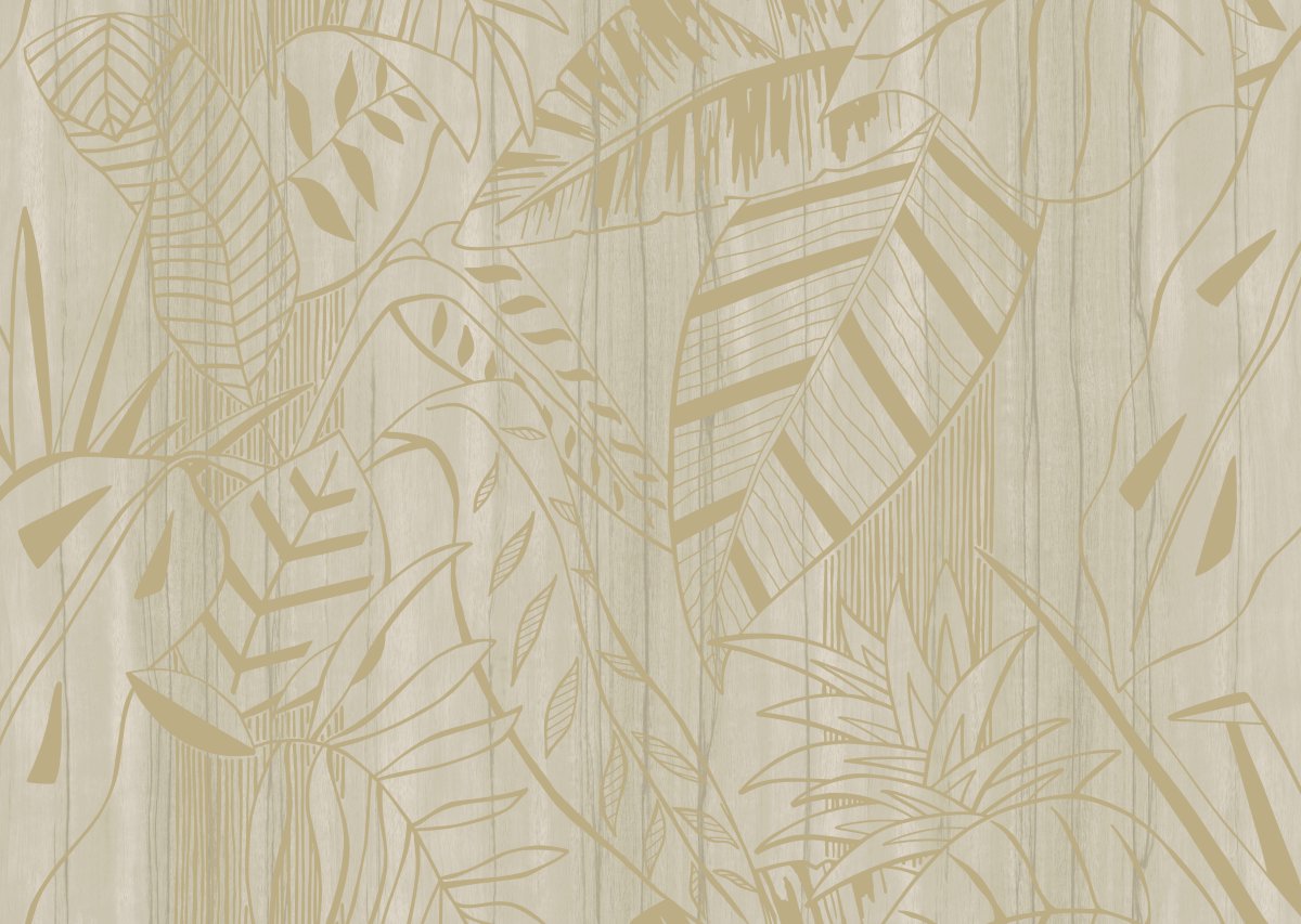 A paradisiacal jungle motif with stylised plants and tree trunks against a soft touch background of wood grains. The high-gloss foil reflects the light, making it look as if the sun’s rays are shimmering through the bush.