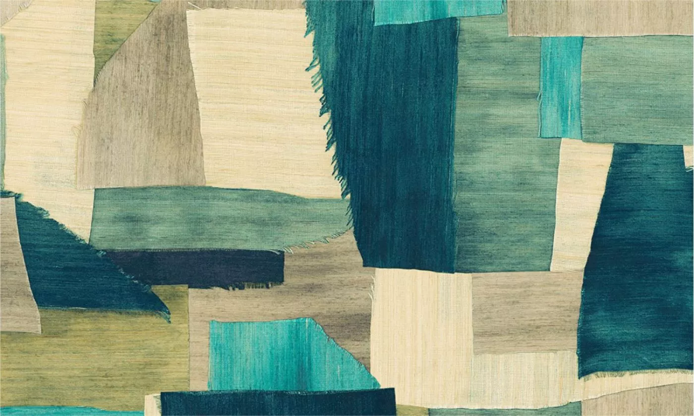 Description: Wallcovering in which combinations of various large textile surfaces form a frivolous and irregular patchwork