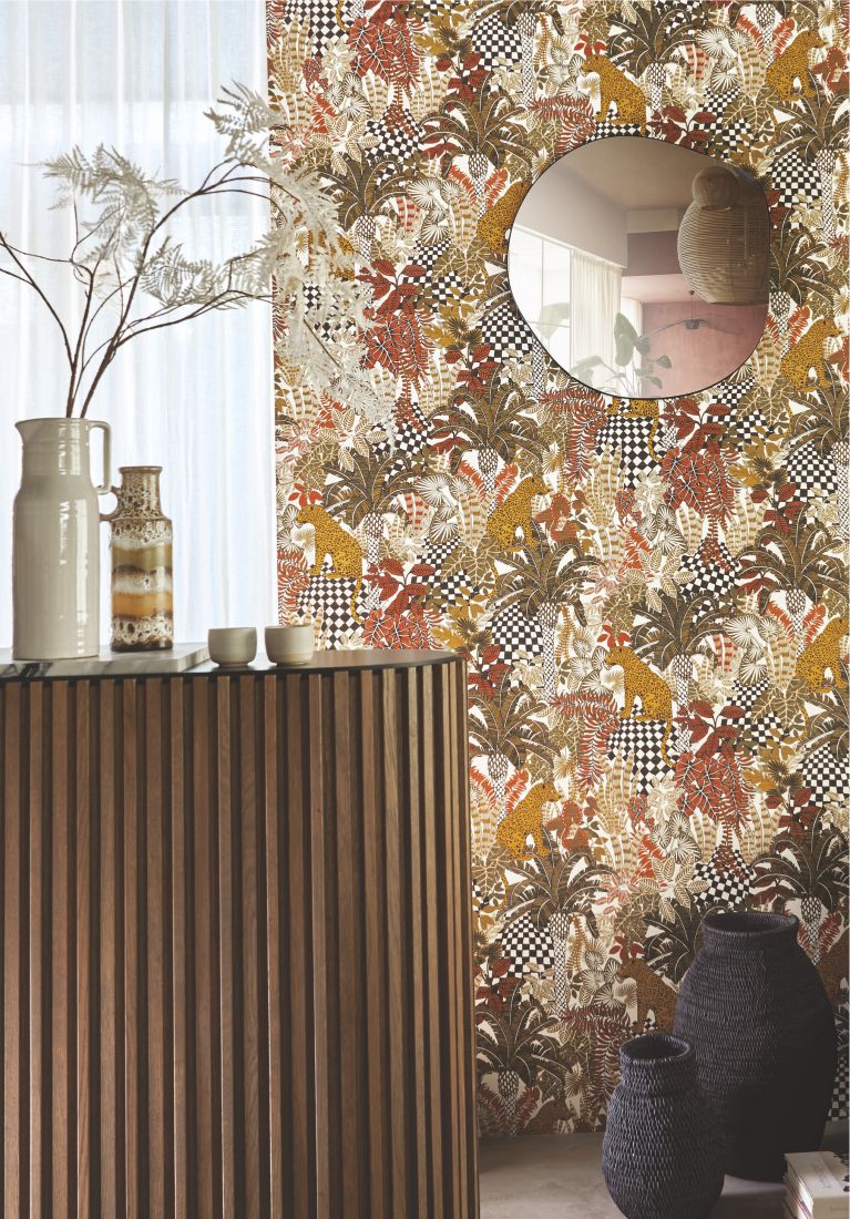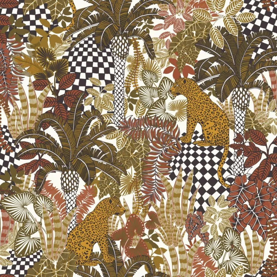 A landscape of great richness, where the abundance of details refers to the density of the Belize jungle in Central America. In a design of a real modernity, a whole tropical paradise awakens on paper. It integrates a new and surprising geometry in the form of a checkerboard into a teeming plant universe. This pattern is the subject of great finesse in the quality of printing and the mixing of colors, which are obtained by a photogravure process. A straw grain gives the entire design a matte, natural appearance and precious volumes.
