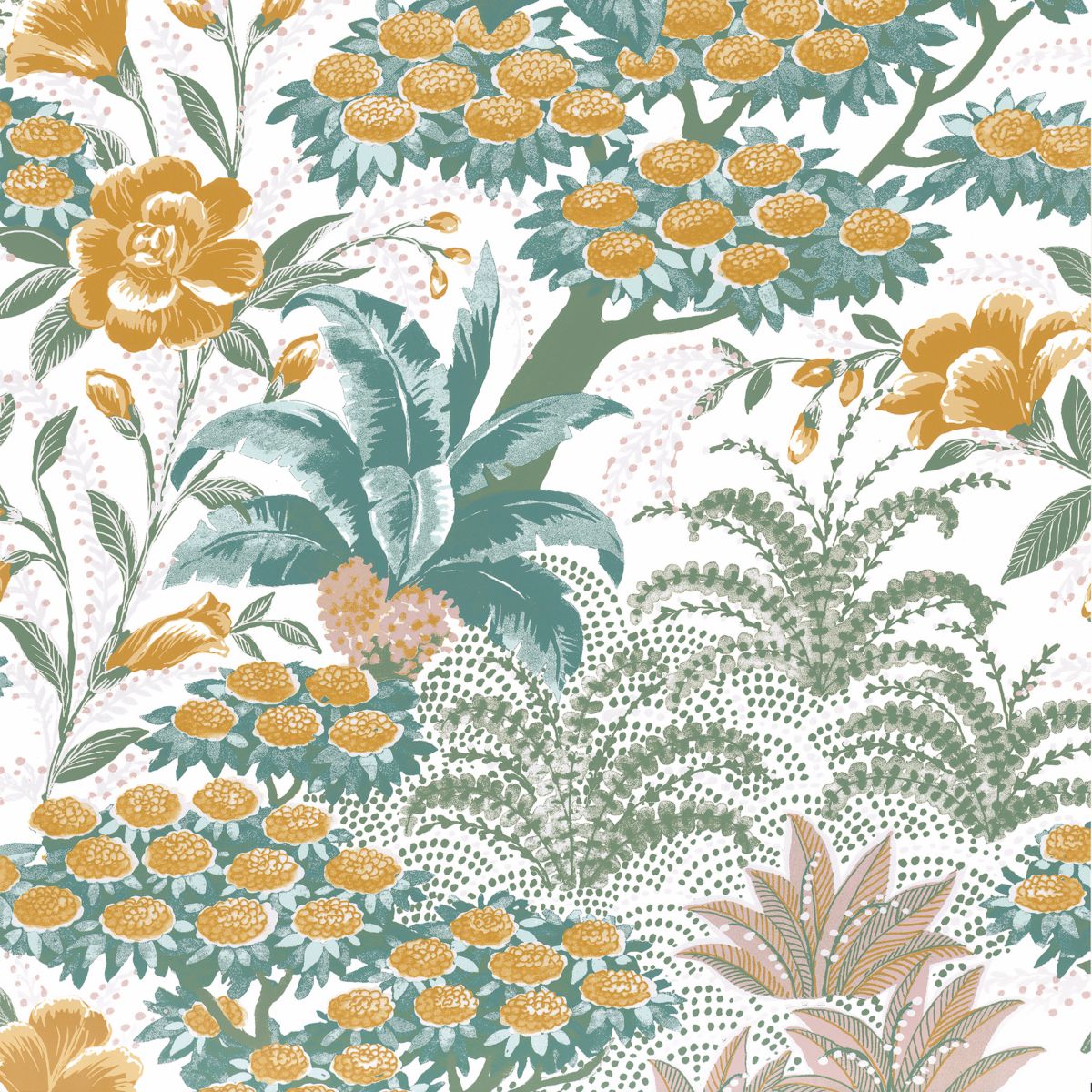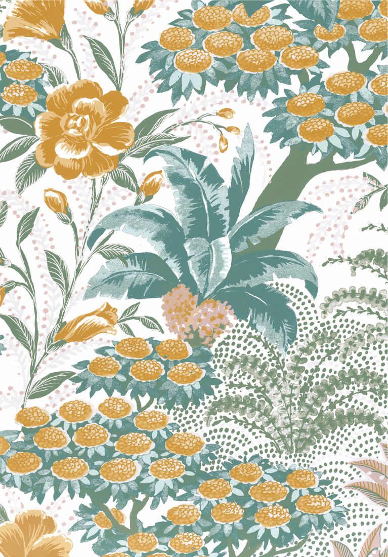 A living explosion of plants with the Alba rose. In a baroque style, leaves and flowers unfurl and blossom on the paper. The cheerful colours of the summers’ end are translated by the matte inks. These strong colours are obtained by the using eight print cylinders. This design coordinates with the Cité des roses fabric.