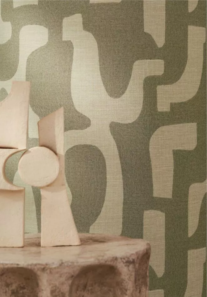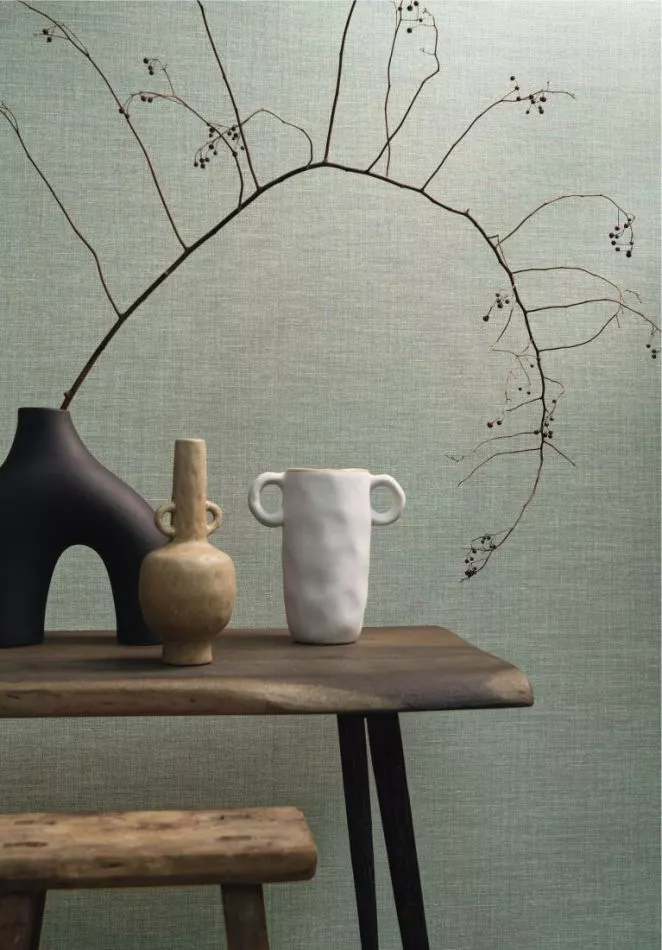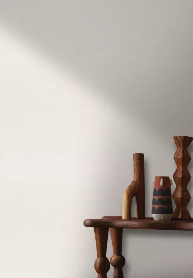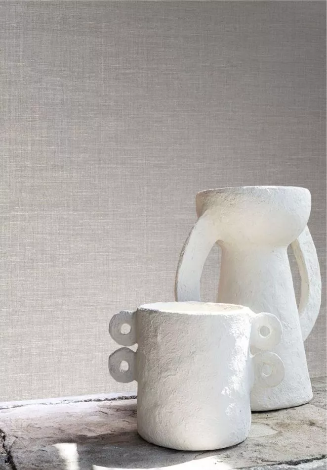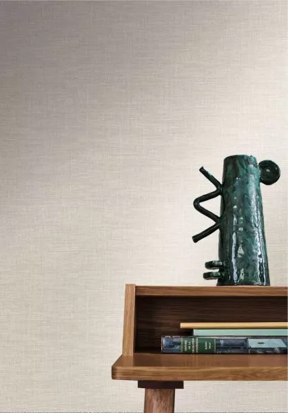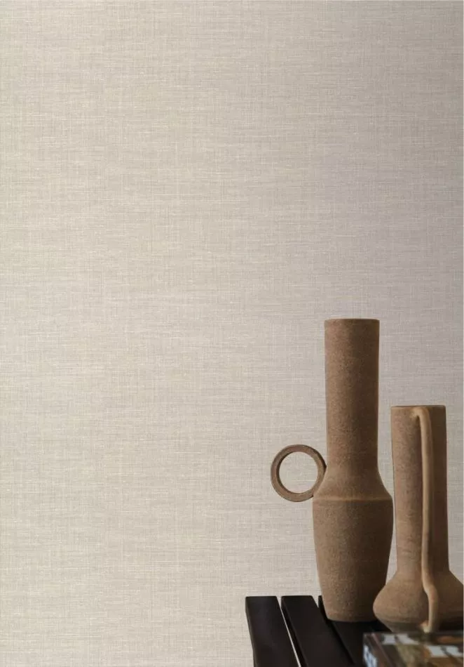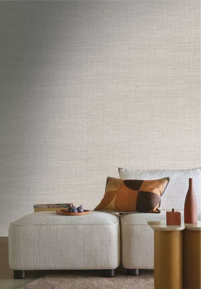 An irregular weave and subtle tonal variations give the wallpaper a textile appearance.