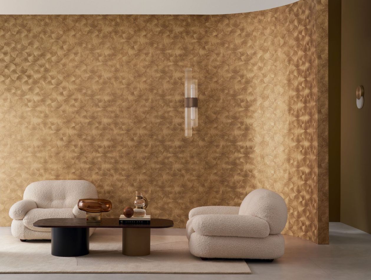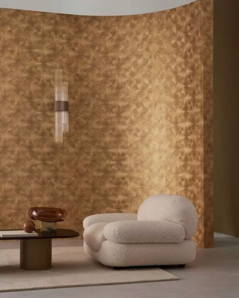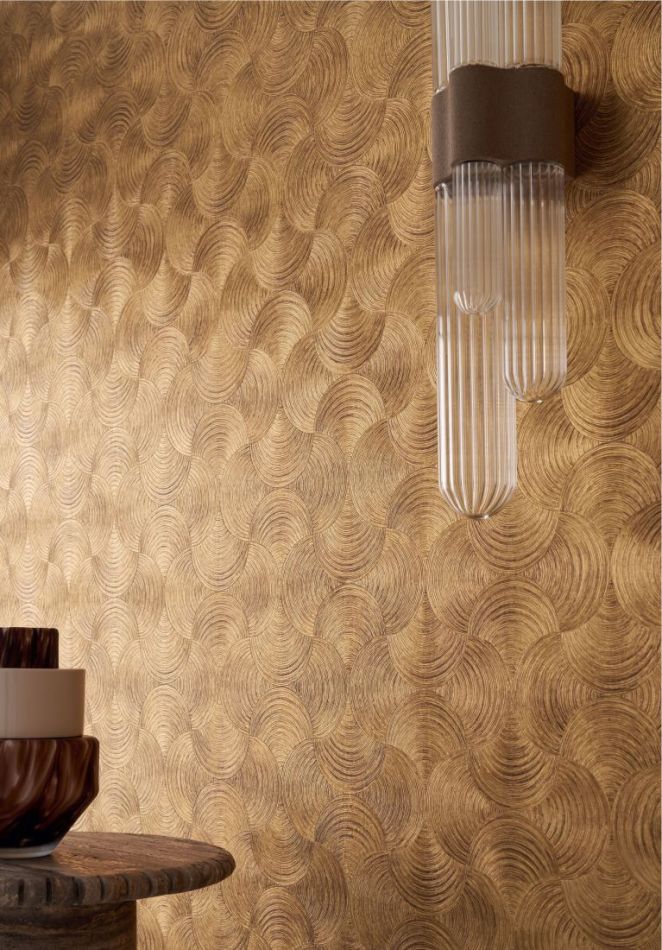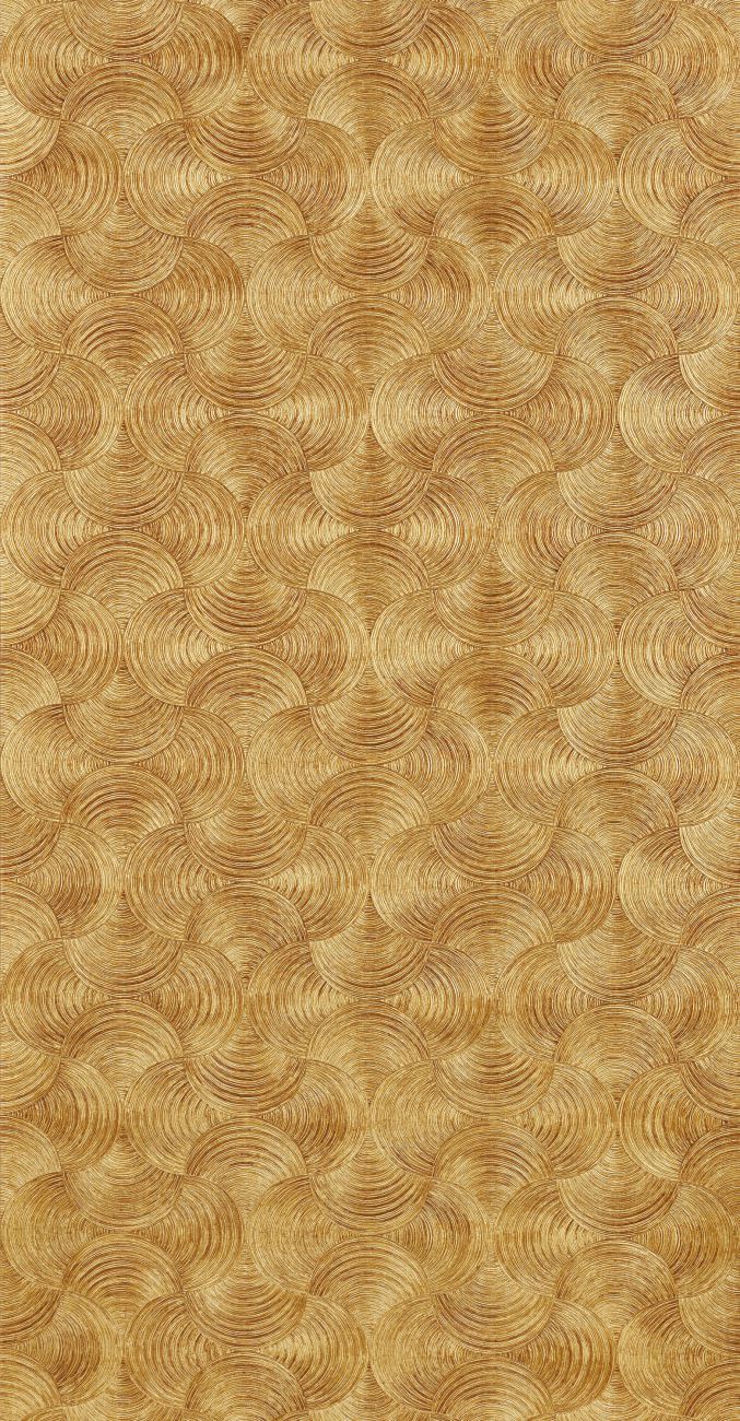 This is when the Earth steps back from its dance around the Sun. The aphelion is expressed as a deeply-textured design, illustrated with rounded palmettes that merge together like stars. APHELIE is available on a gold, silver or copper-toned foil on which the patinated design emphasizes the scale of this texture.