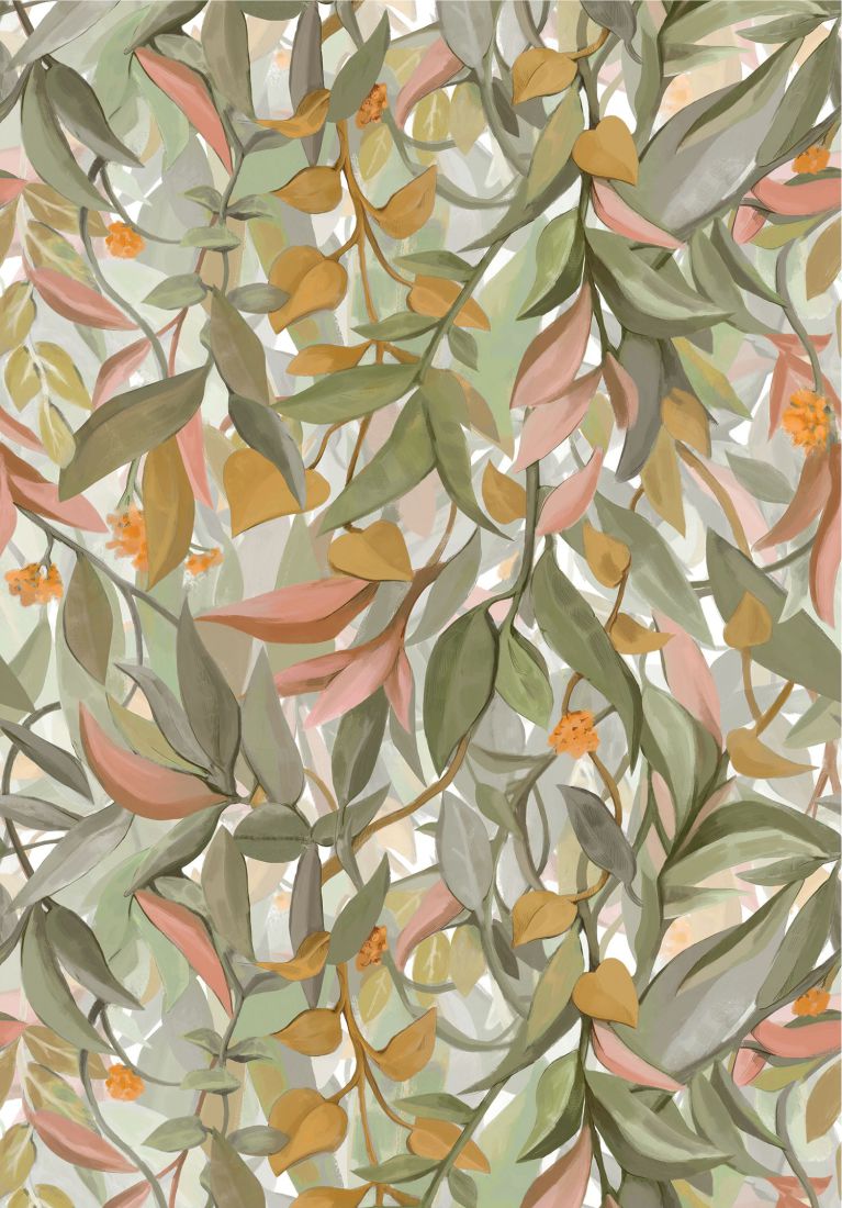 SOLANDRA is an «all over» foliage design that coordinates with WISTERIA. We suggest using it on the ceiling to continue the wallpanel. It looks like a traditional wallpaper and is digitally printed to match the colours of the WISTERIA wallpanel. However slight colour variations may occur between the WISTERIA wallpanel and the SOLANDRA wallpaper. Both references are coordinated without being matchable.
