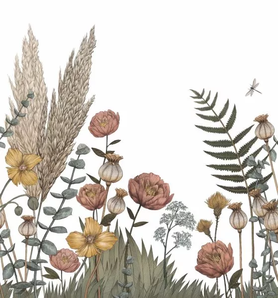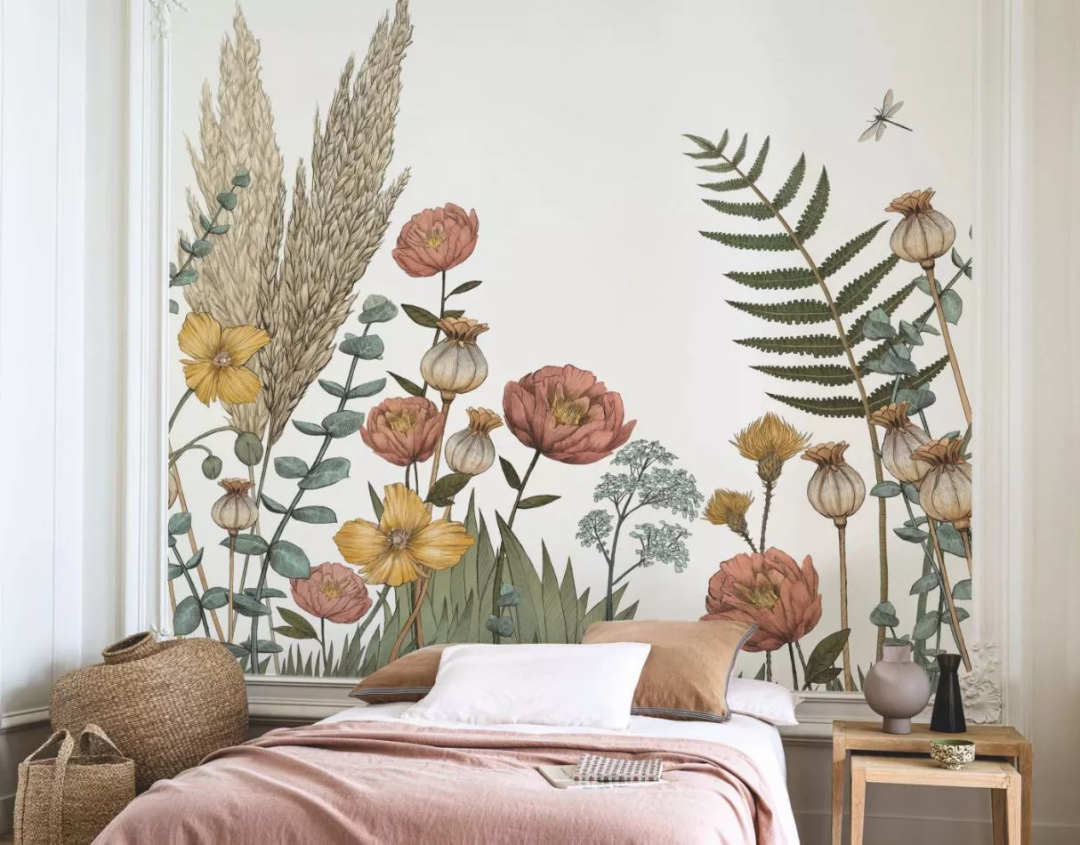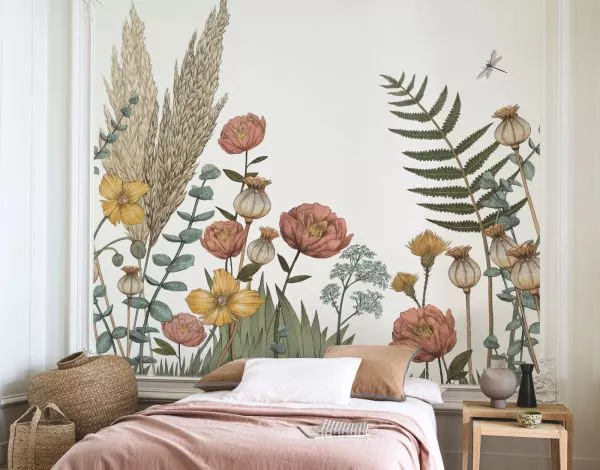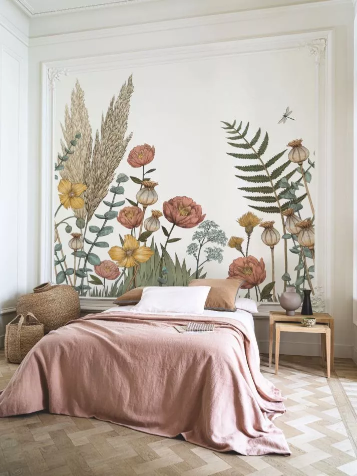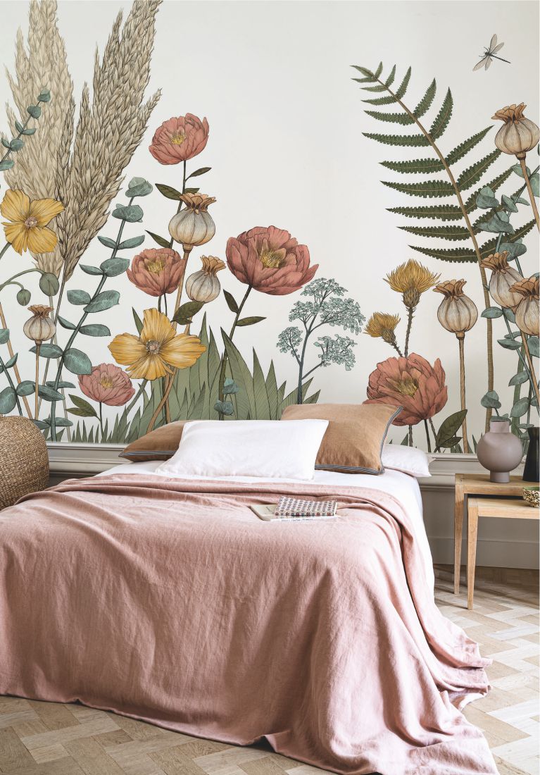 Botanical poetry. Poppies and pampas grass blossom on the walls, bringing a bucolic touch to your interior. This design has been hand-drawn, especially for Casamance.