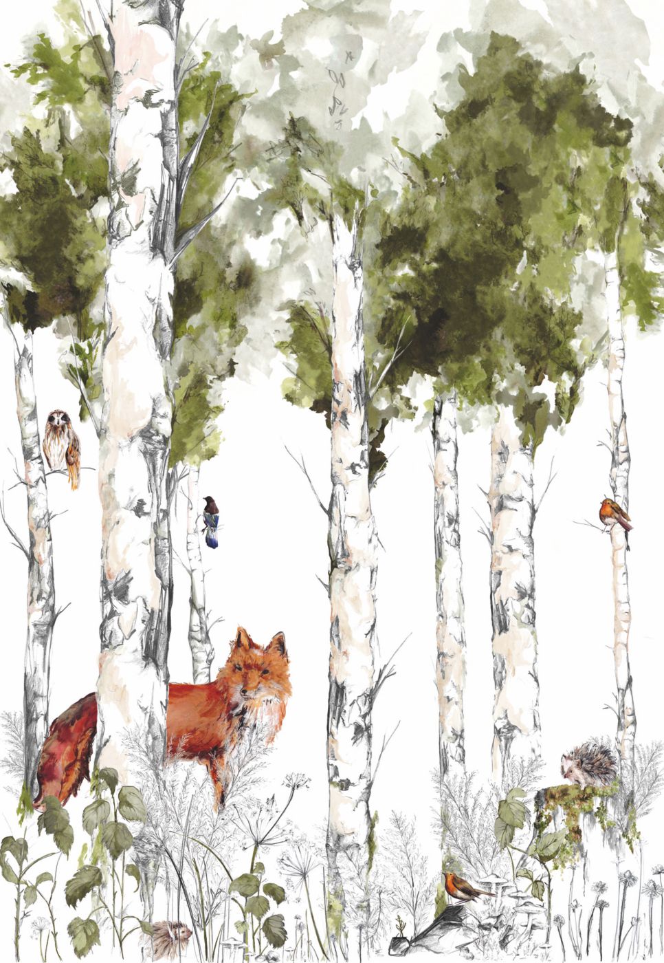 Inspired by the deity of trees, Sylvania wallpanel is a beautiful representation of the forest. In watercolours, the fox and the birch leaves stand out from the rest of the painting. This entire design has been hand-painted using watercolours and pastels by one of our stylists.