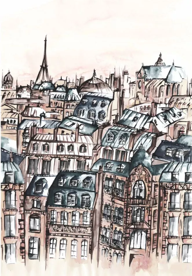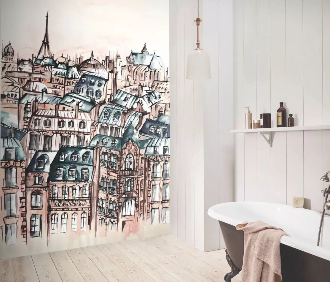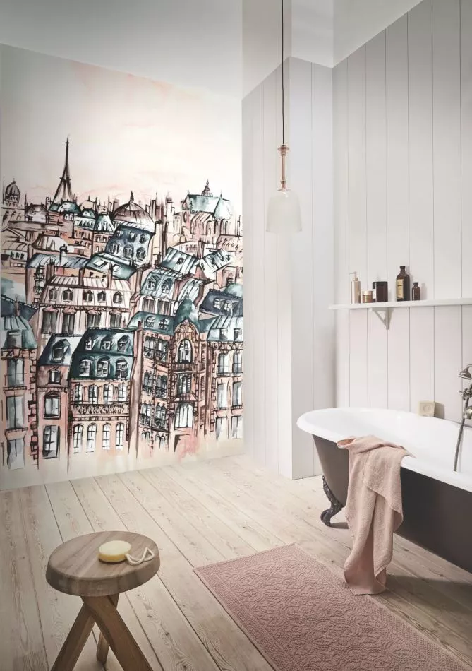 Walk along the wide Parisian boulevards, with their Haussmann-style mansions, art galleries and theatres. The spirit of Paris delights the walls. Grands Boulevards wallpanel has been entirely hand-drawn in coloured inks by one of our stylists.