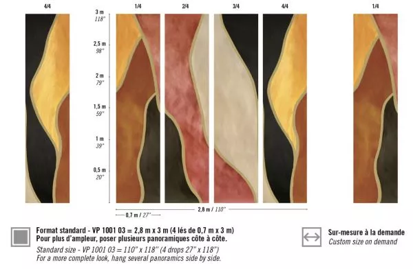 Measurements +/- 3% : Standard of 2.8 m x 3 m (110''x118'') available in 4 drops of 0.7 m (27") or Custom size